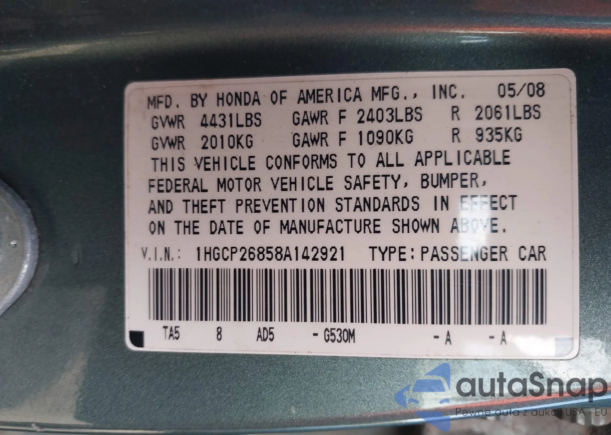 VIN: 1HGCP26858A142921