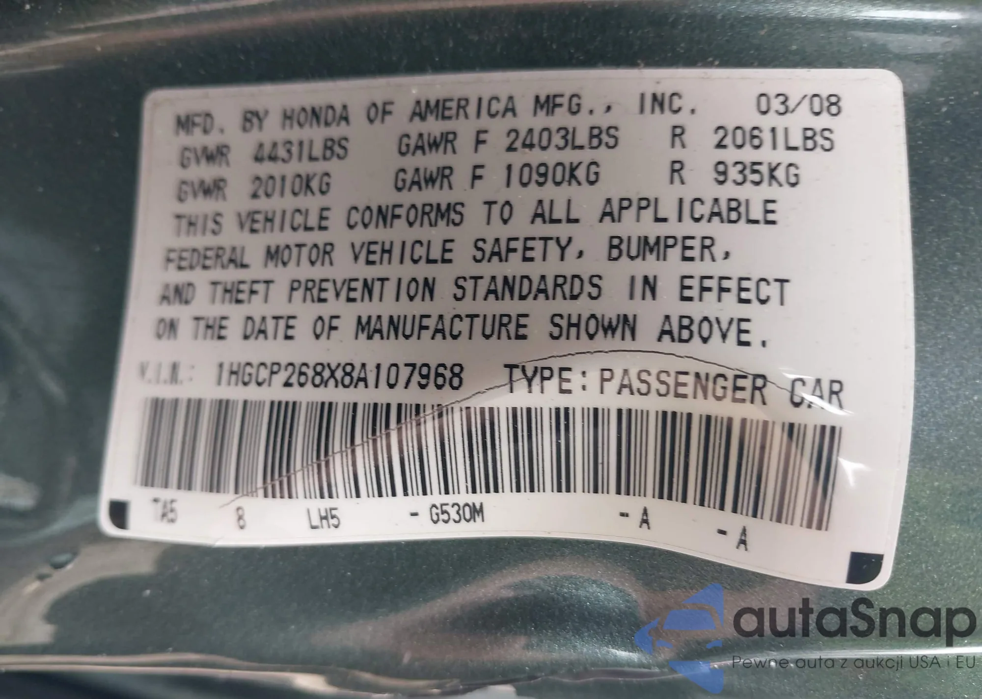 VIN: 1HGCP268X8A107968