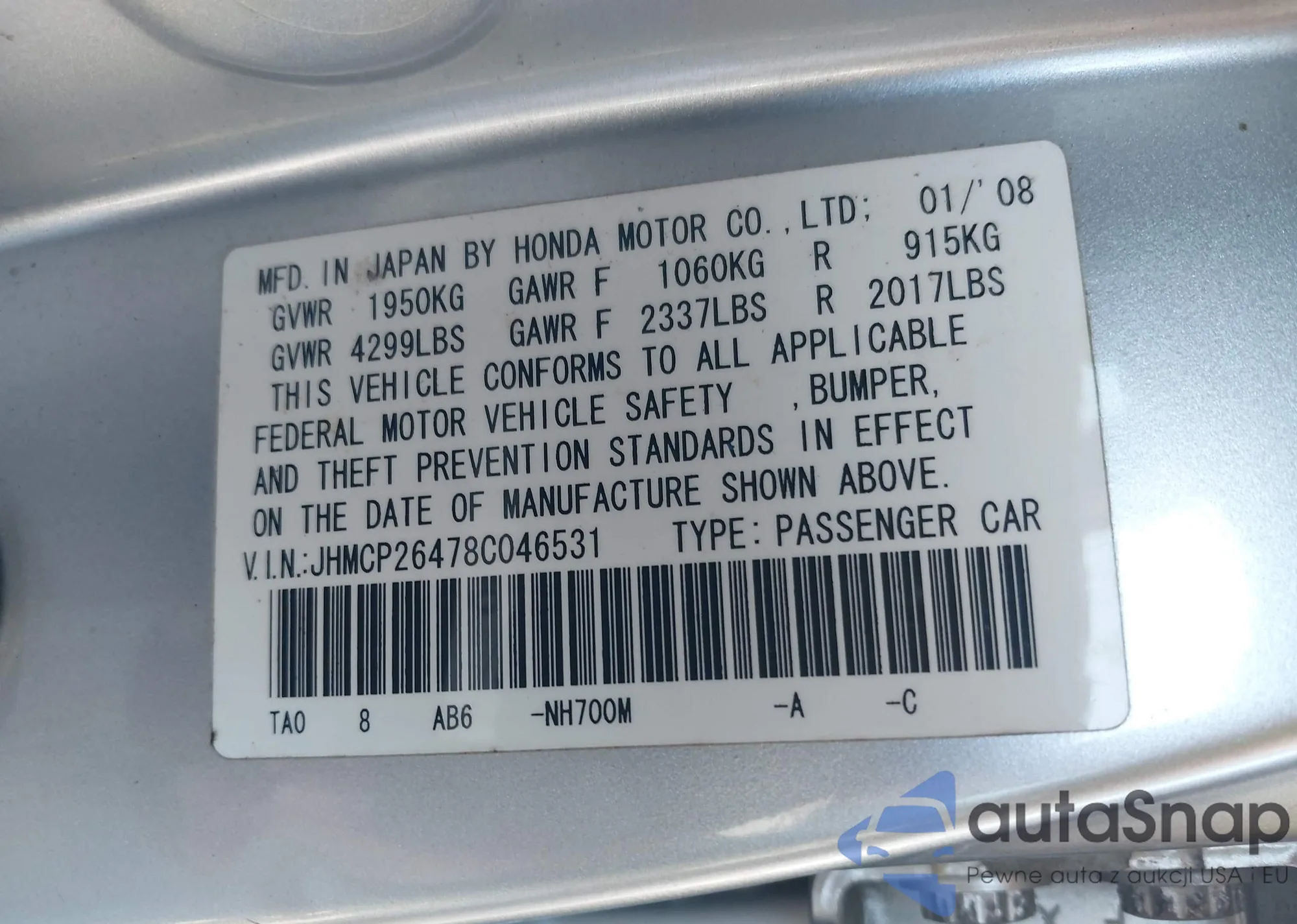The car Honda Accord 2008 (VIN JHMCP26478C046531) has not been auctioned before. The documents are clean, and the mileage matches or is below the market average. Sold by an insurance company – we recommend purchase. Delivery to the port will take approx. 6–8 weeks.