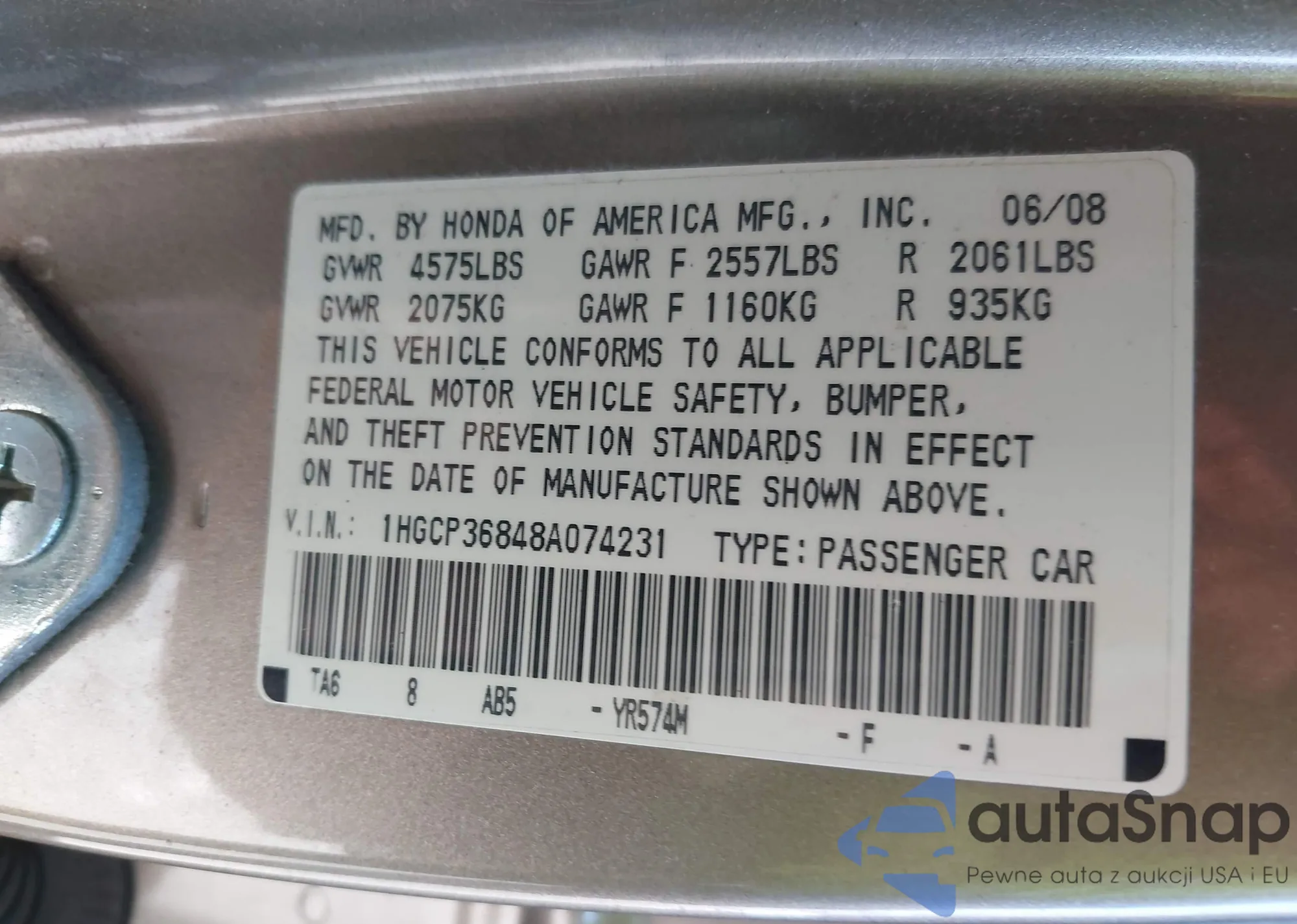 VIN: 1HGCP36848A074231