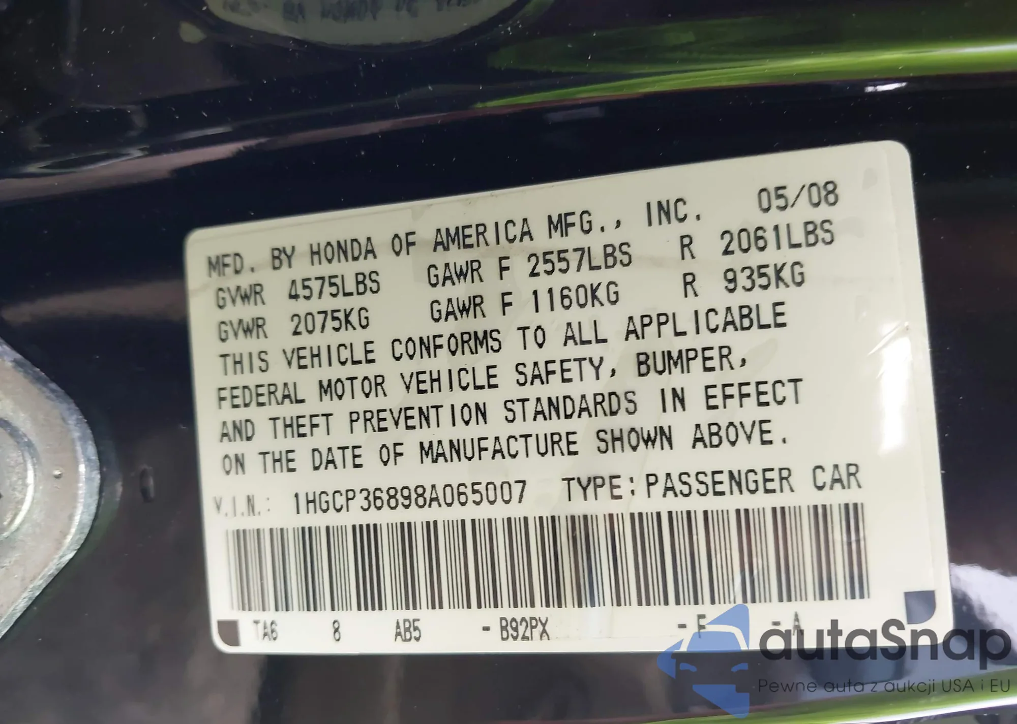 VIN: 1HGCP36898A065007