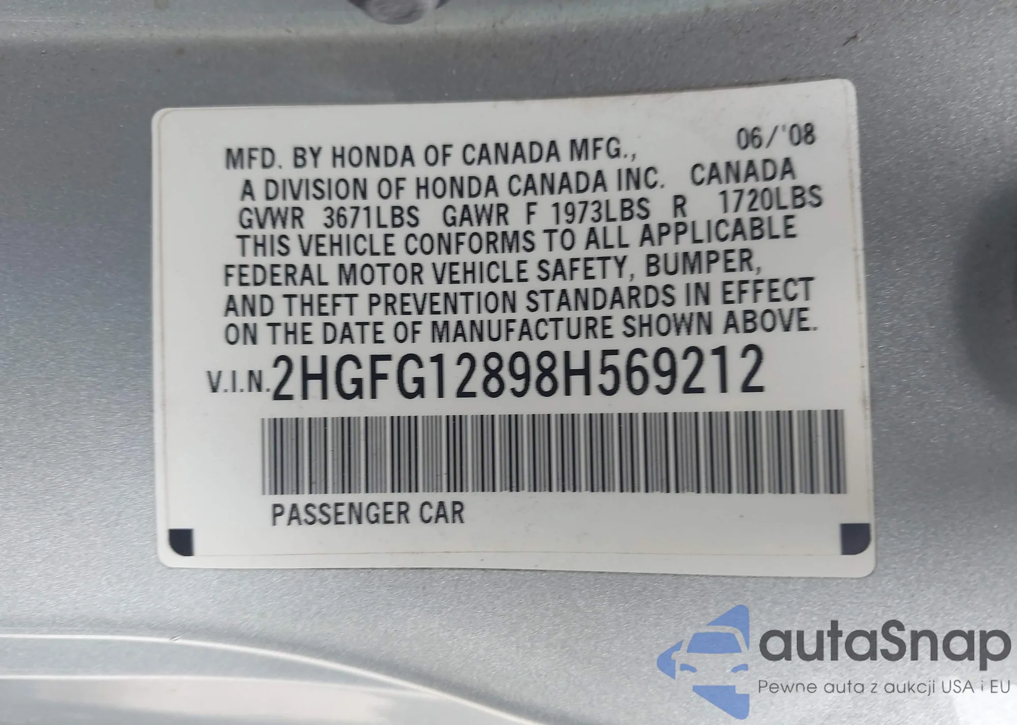 VIN: 2HGFG12898H569212