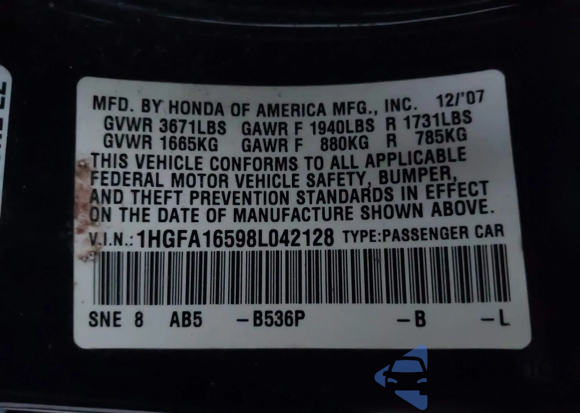 VIN: 1HGFA16598L042128