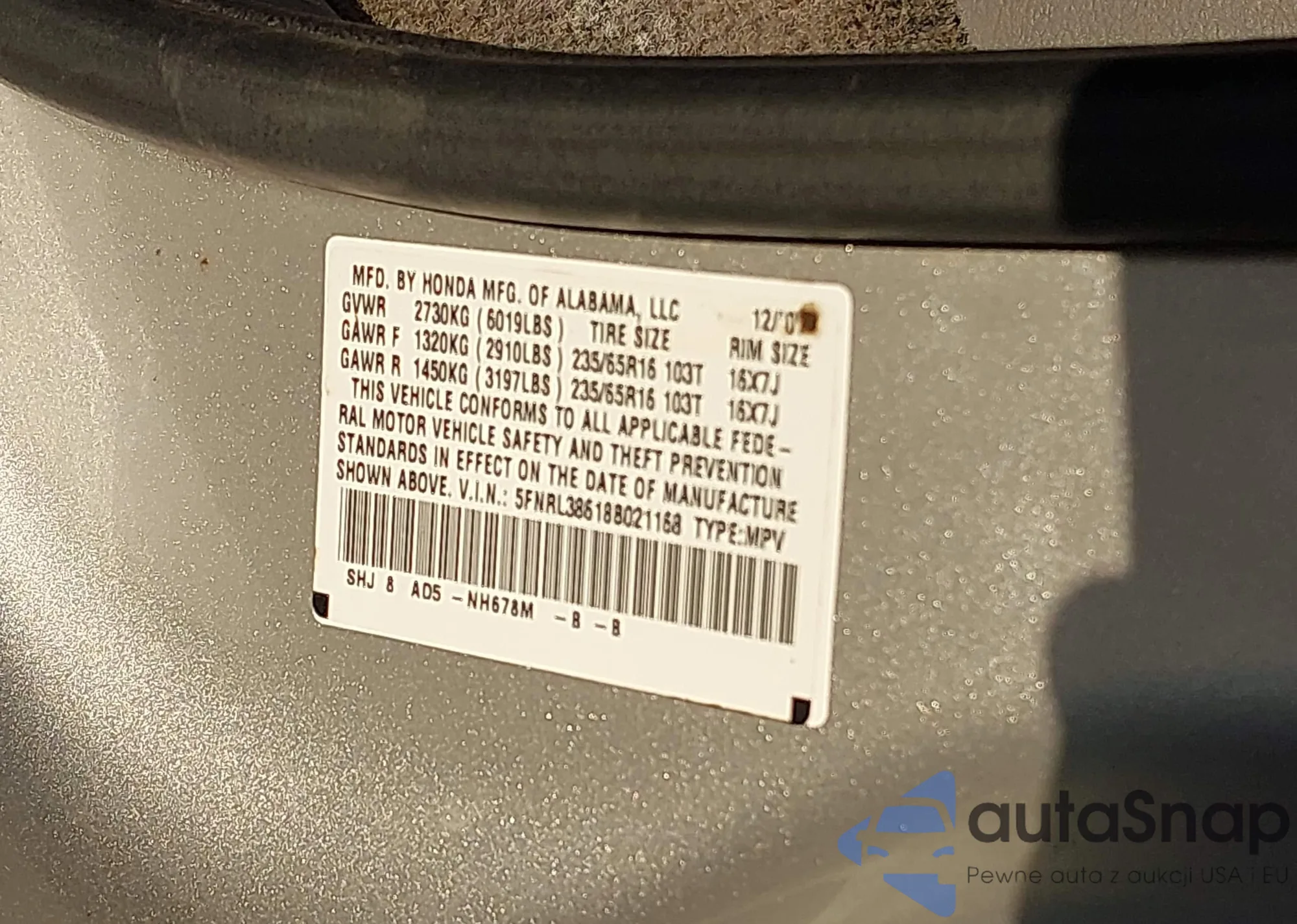 VIN: 5FNRL38618B021168