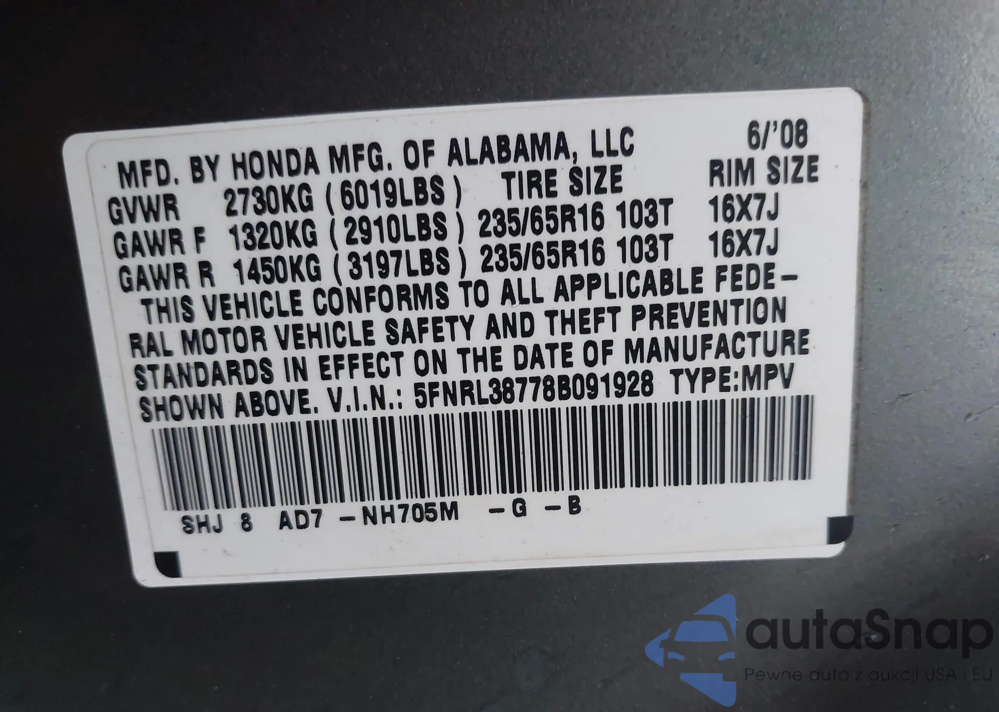The car Honda Odyssey 2008 (VIN 5FNRL38778B091928) has not been auctioned before. The documents are clean, and the mileage matches or is below the market average. Sold by an insurance company – we recommend purchase. Delivery to the port will take approx. 6–8 weeks.