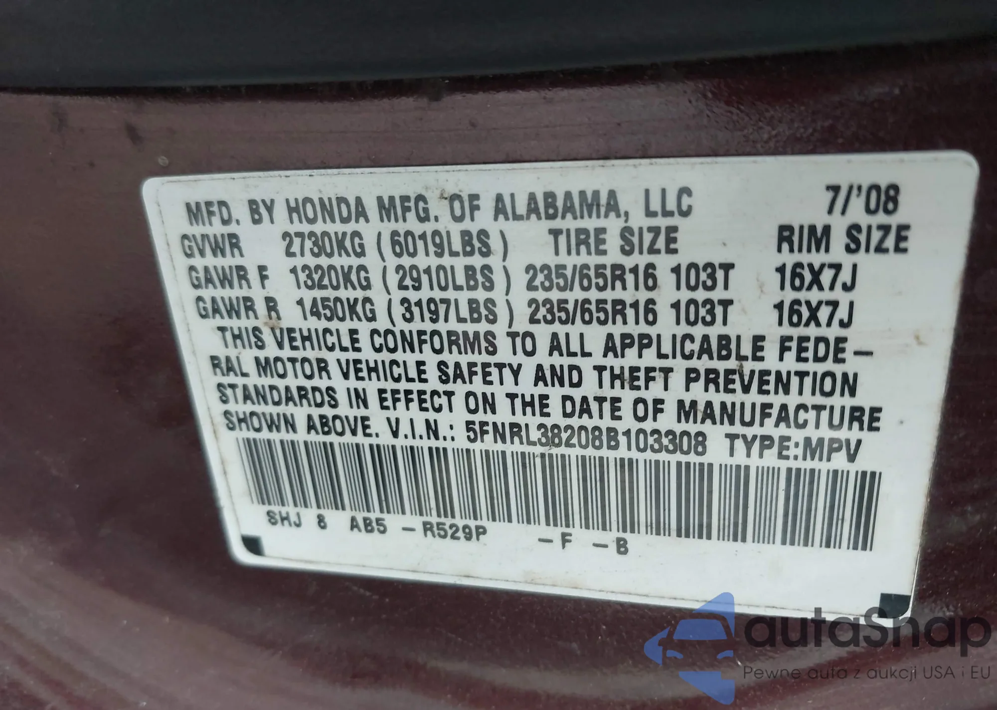 VIN: 5FNRL38208B103308