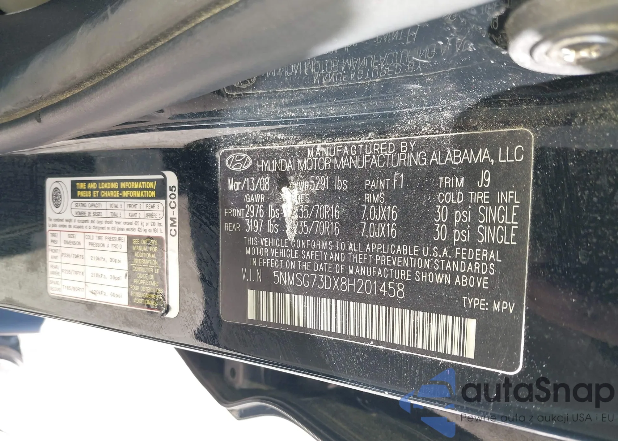 The car Hyundai Santa Fe 2008 (VIN 5NMSG73DX8H201458) has not been auctioned before. The documents are clean, and the mileage matches or is below the market average. Sold by an insurance company – we recommend purchase. Delivery to the port will take approx. 6–8 weeks.