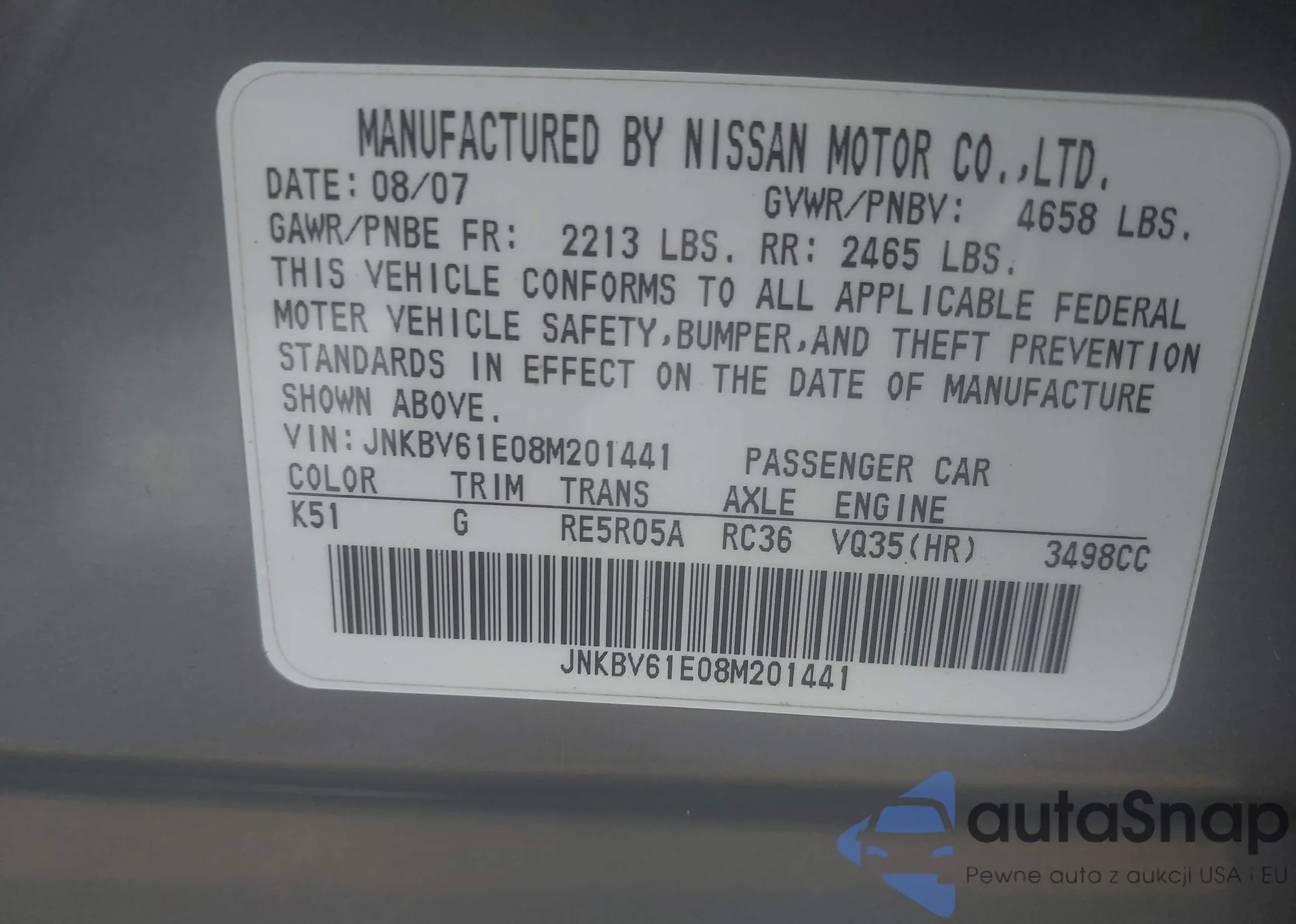 The car Infiniti G 2008 (VIN JNKBV61E08M201441) has not been auctioned before. The documents are clean, and the mileage matches or is below the market average. Sold by an insurance company – we recommend purchase. Delivery to the port will take approx. 6–8 weeks.