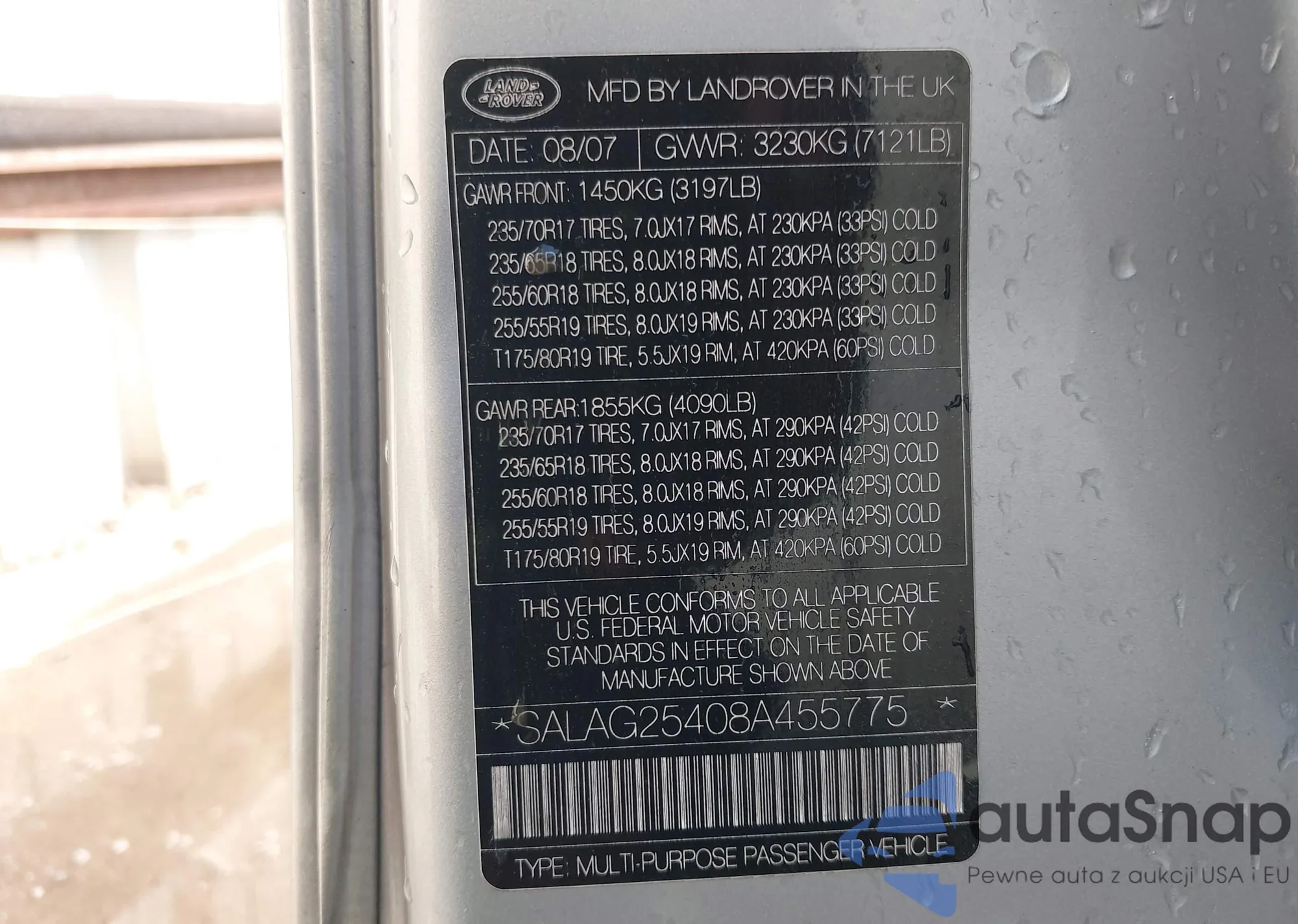 The car Land Rover LR3 2008 (VIN SALAG25408A455775) has documents that prevent registration. Export and registration may be difficult. Contact AutaSnap experts to find alternatives.