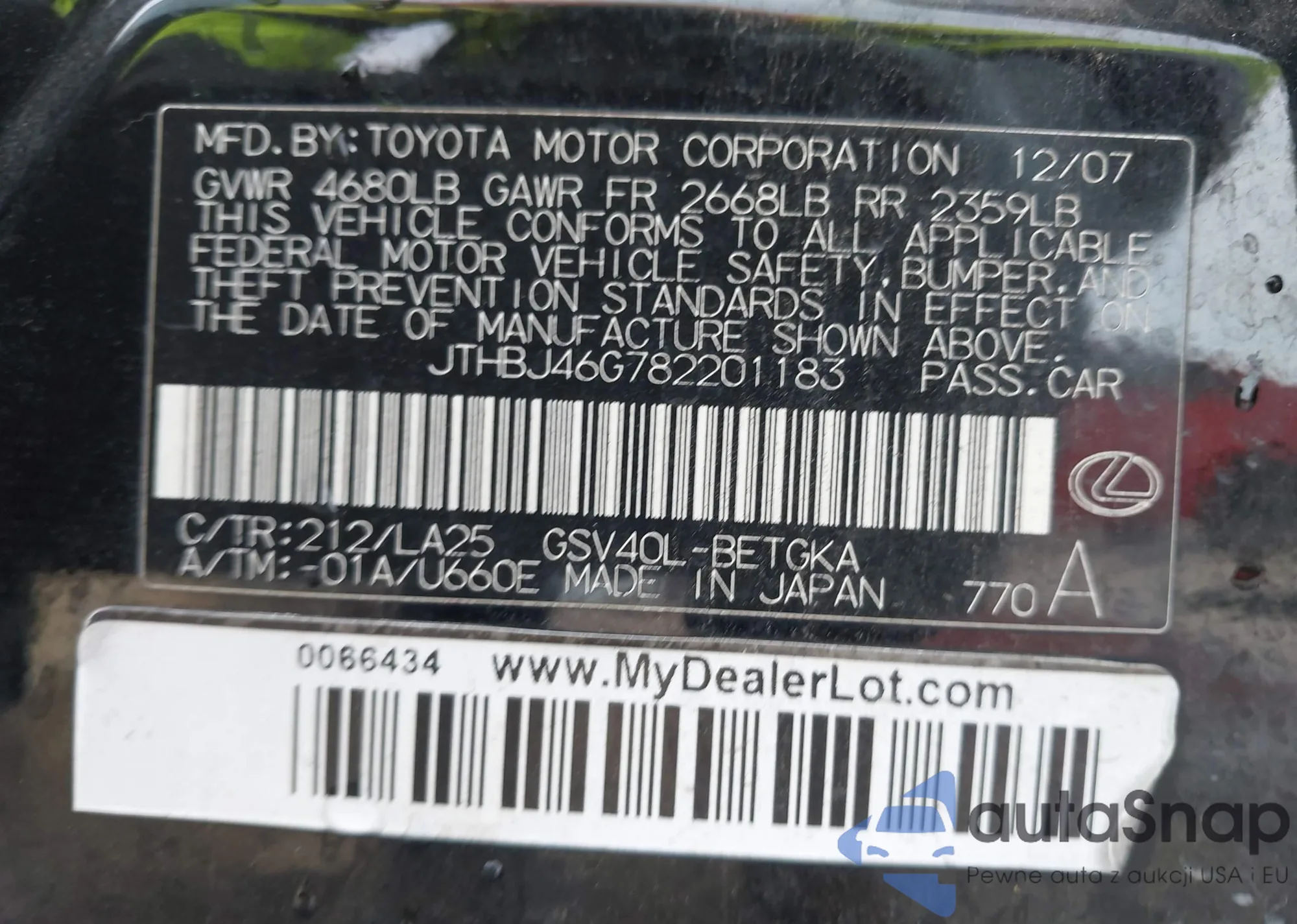 VIN: JTHBJ46G782201183