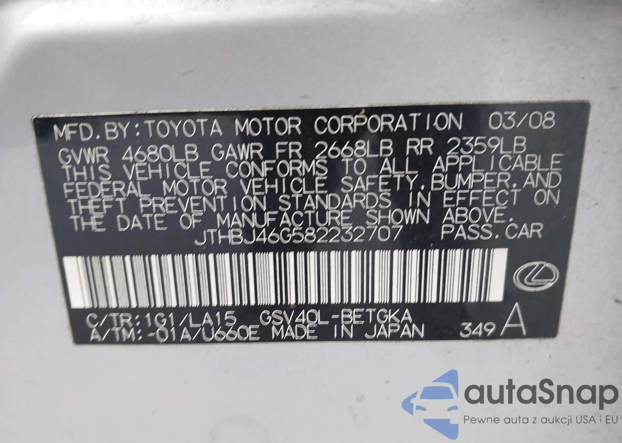 VIN: JTHBJ46G582232707