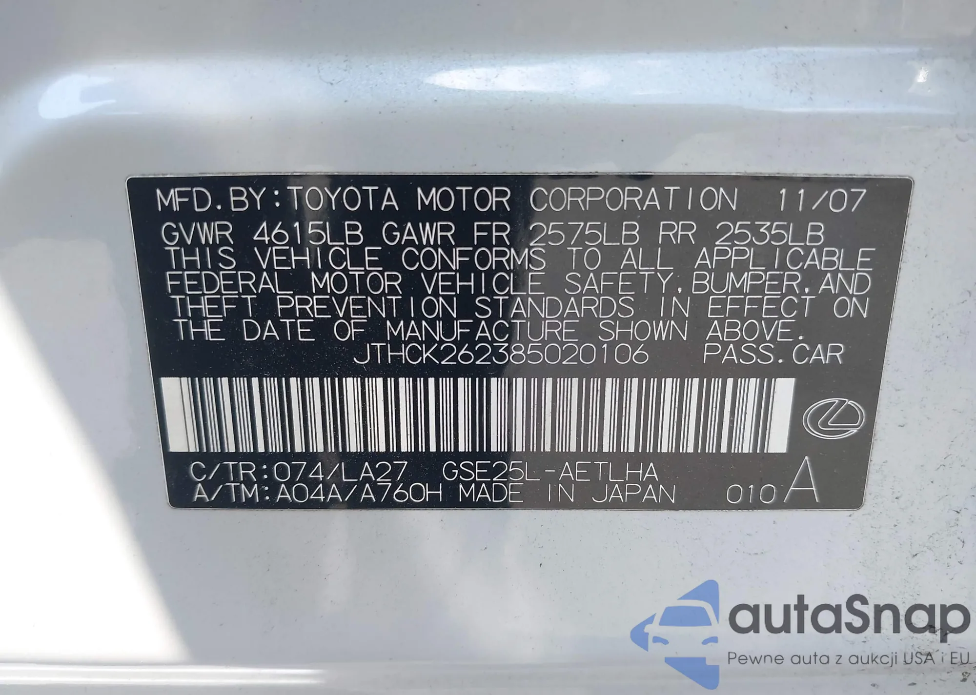 VIN: JTHCK262385020106