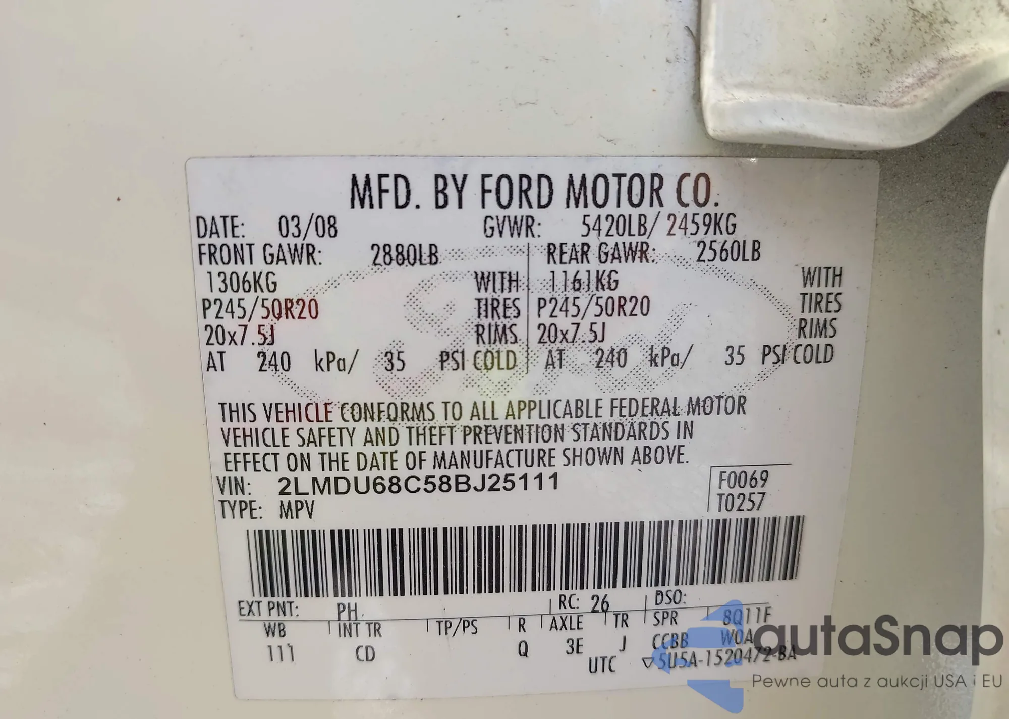 The car Lincoln MKX 2008 (VIN 2LMDU68C58BJ25111) has not been auctioned before. The documents are clean, and the mileage matches or is below the market average. Sold by an insurance company – we recommend purchase. Delivery to the port will take approx. 6–8 weeks.