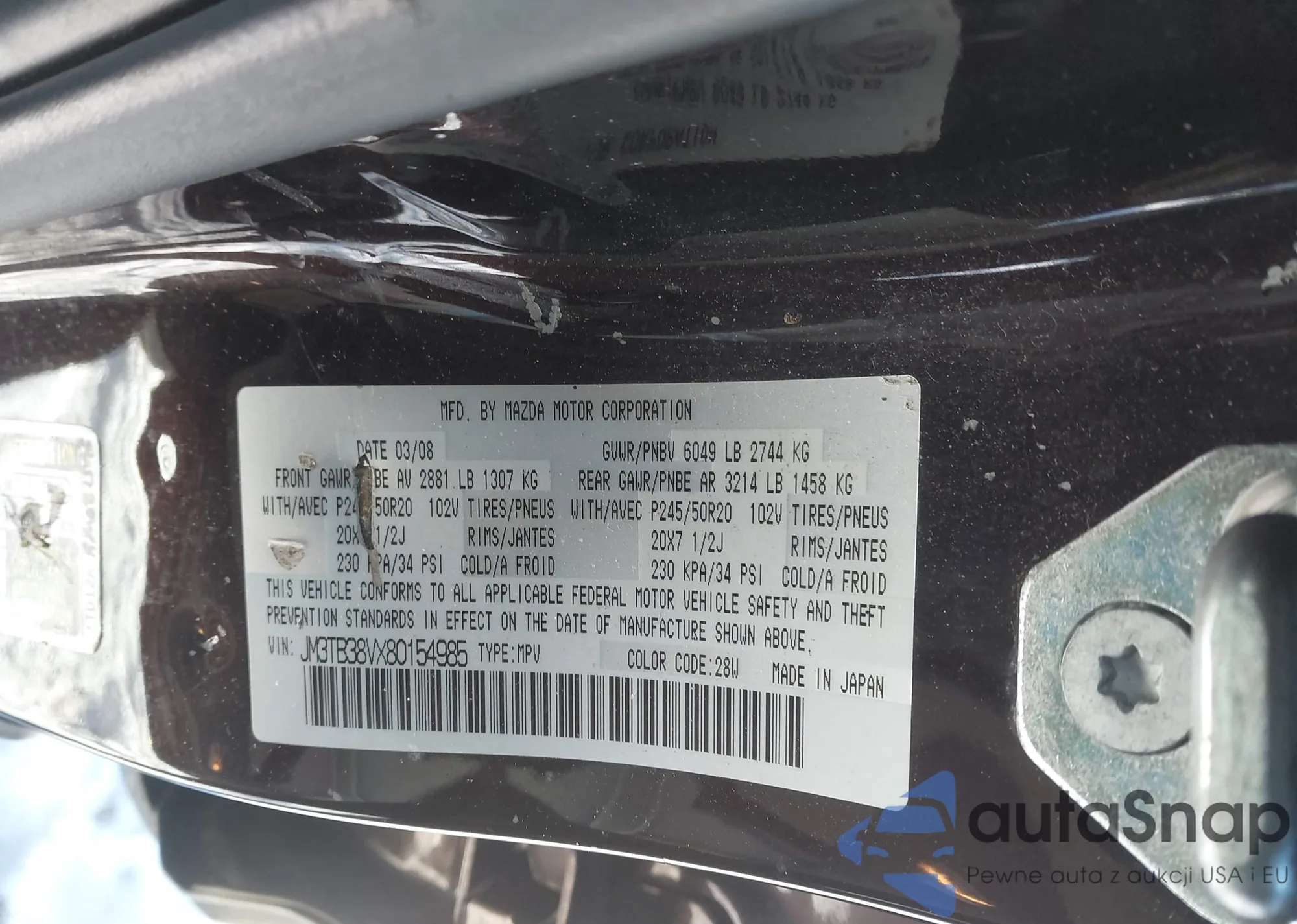 The car Mazda CX-9 2008 (VIN JM3TB38VX80154985) has not been auctioned before. The documents are clean, and the mileage matches or is below the market average. Sold by an insurance company – we recommend purchase. Delivery to the port will take approx. 6–8 weeks.