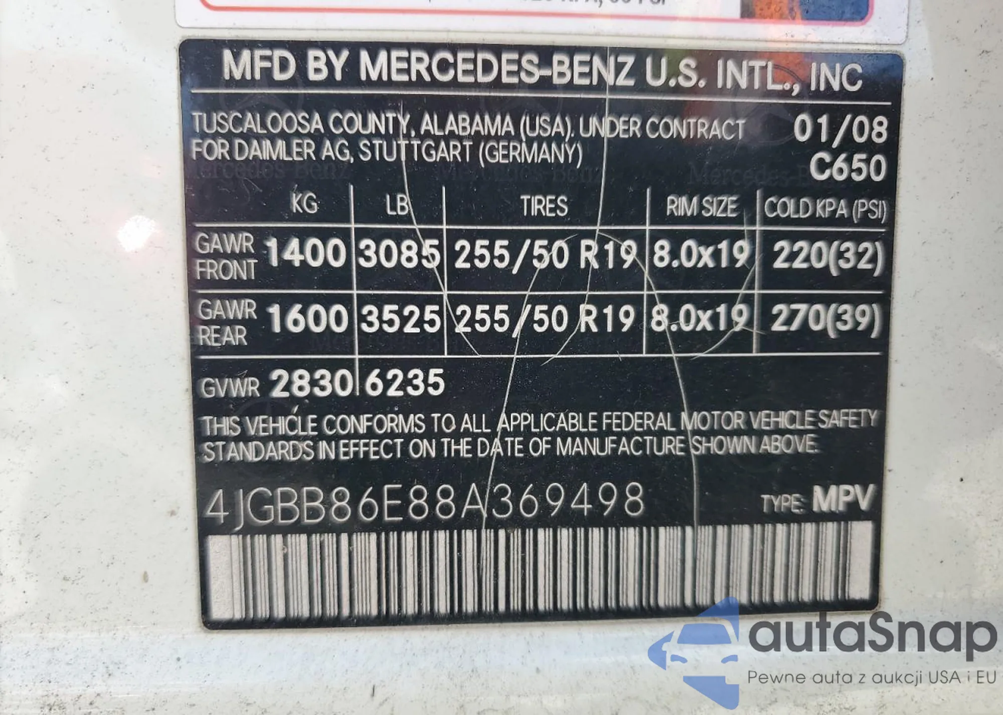 The car Mercedes-Benz M-klasse 2008 (VIN 4JGBB86E88A369498) has documents that prevent registration. Export and registration may be difficult. Contact AutaSnap experts to find alternatives.
