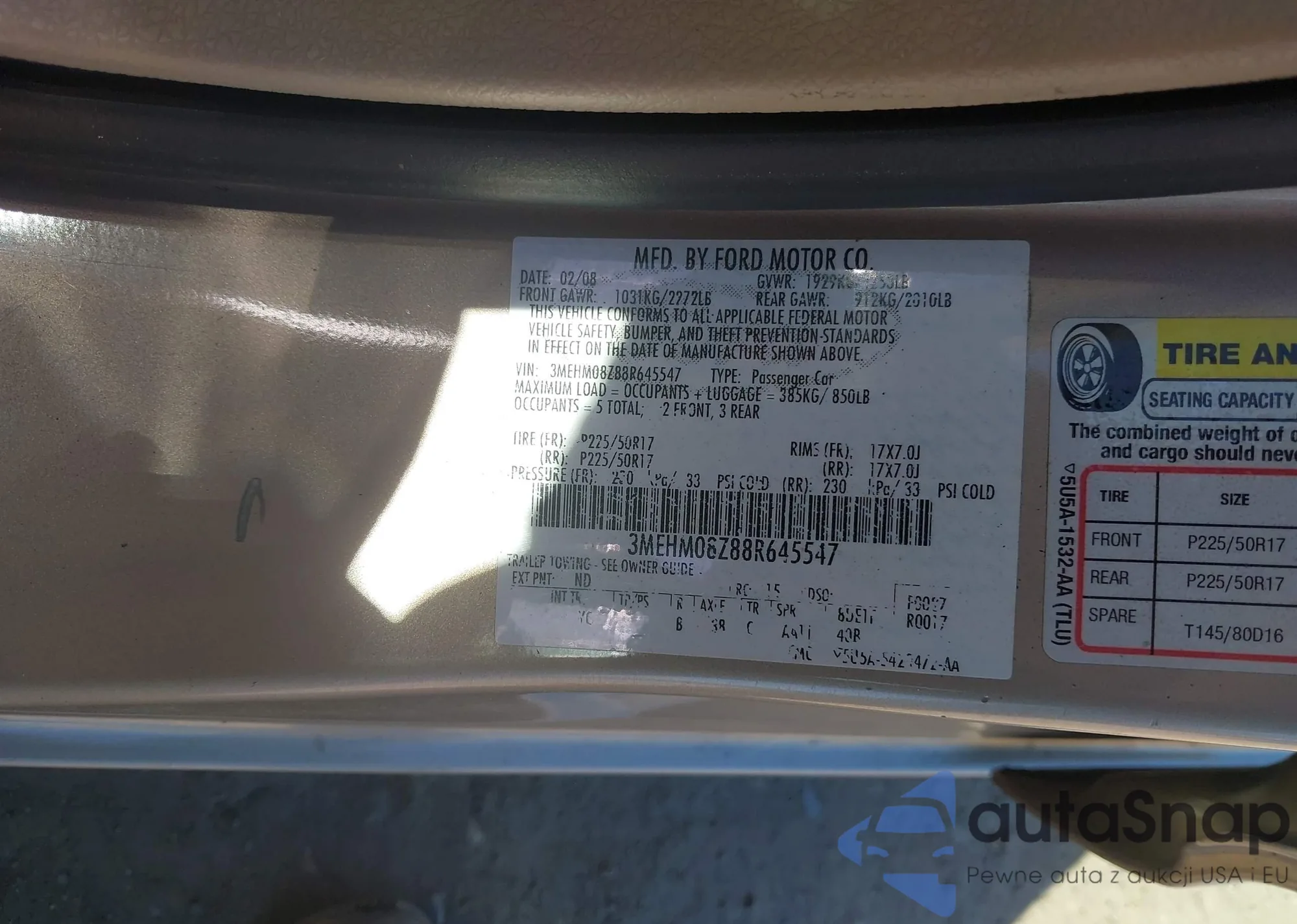 The car Mercury Milan 2008 (VIN 3MEHM08Z88R645547) has not been auctioned before. The documents are clean, and the mileage matches or is below the market average. Sold by an insurance company – we recommend purchase. Delivery to the port will take approx. 6–8 weeks.