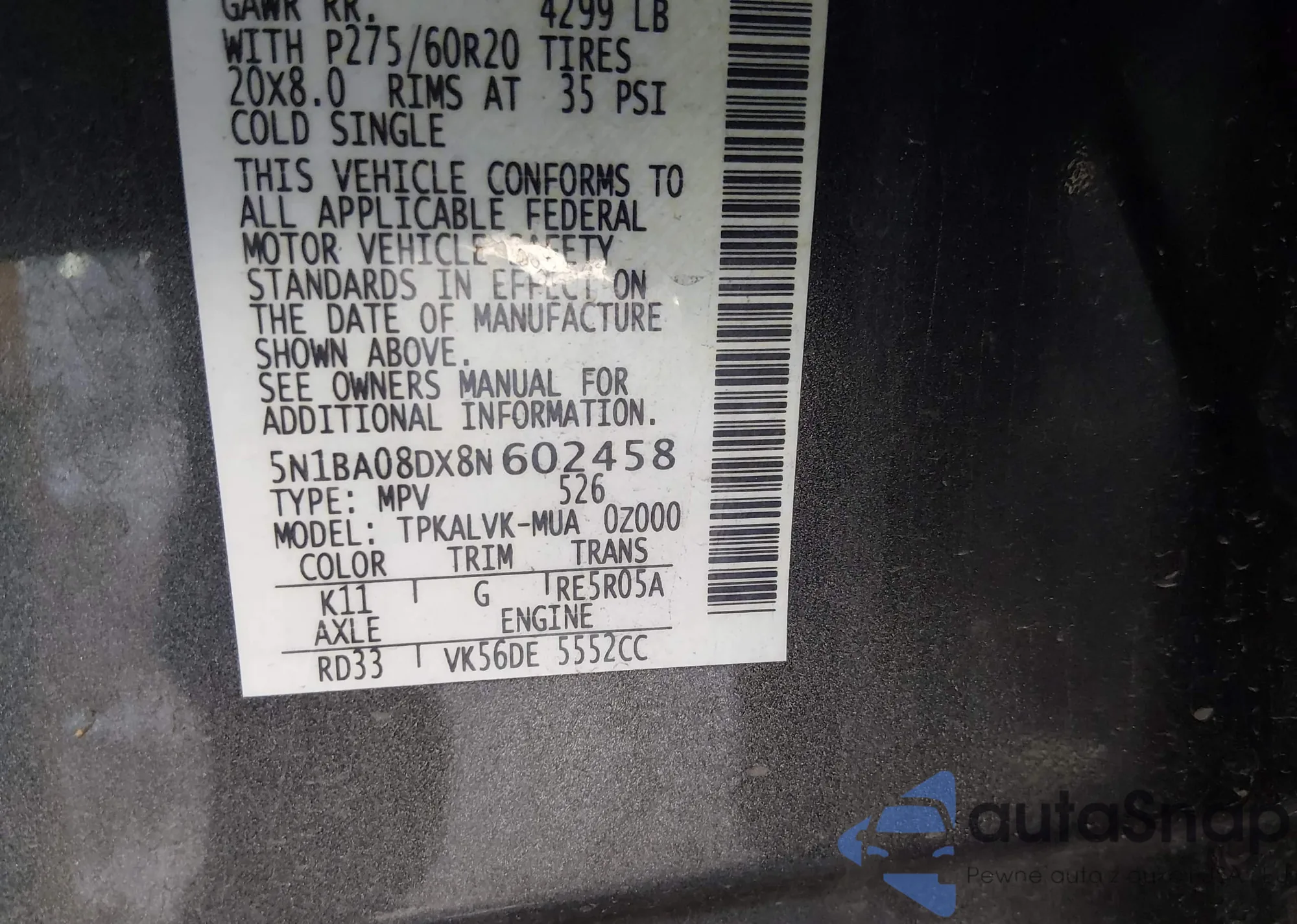 • VIN: 5N1BA08DX8N602458