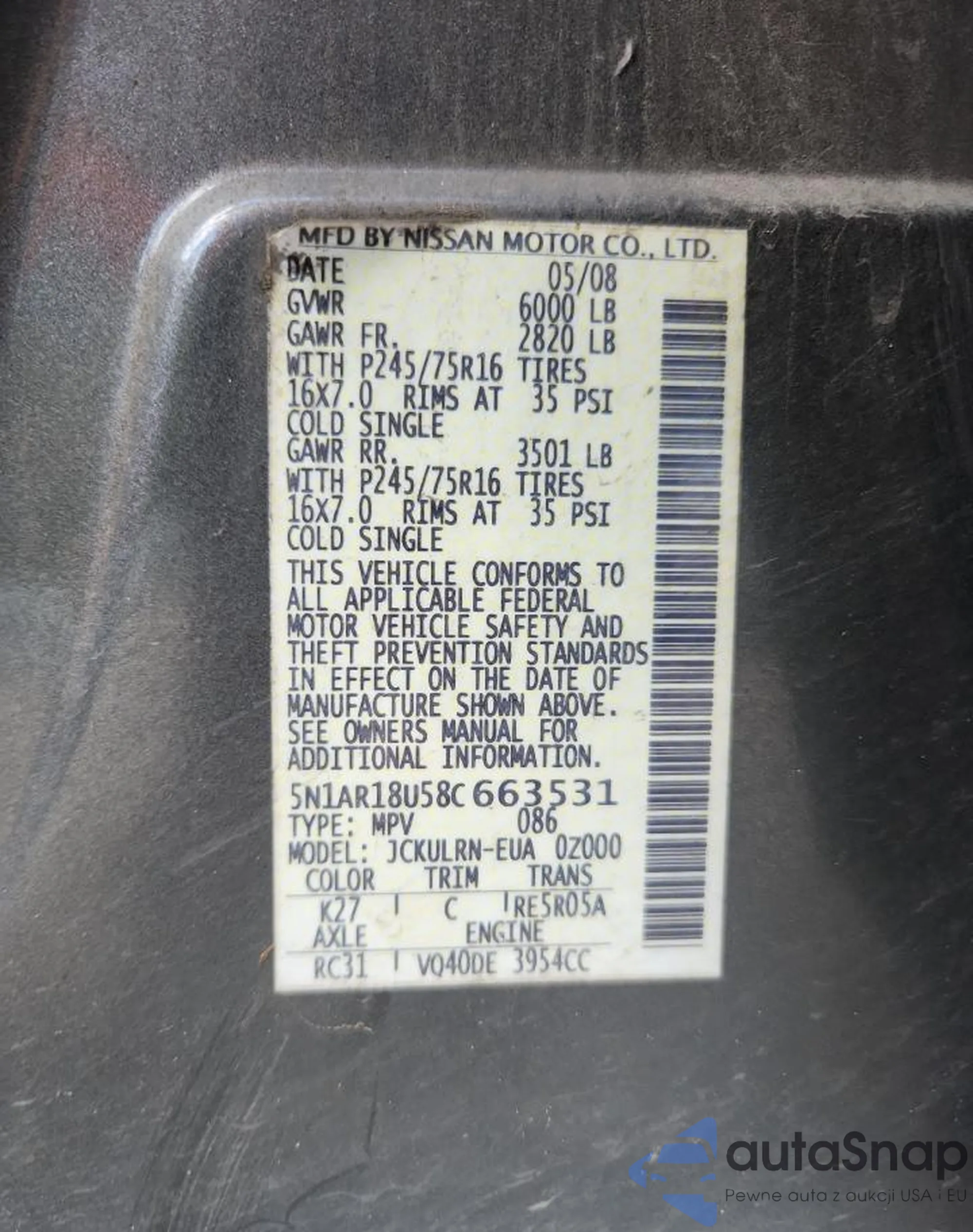 VIN: 5N1AR18U58C663531