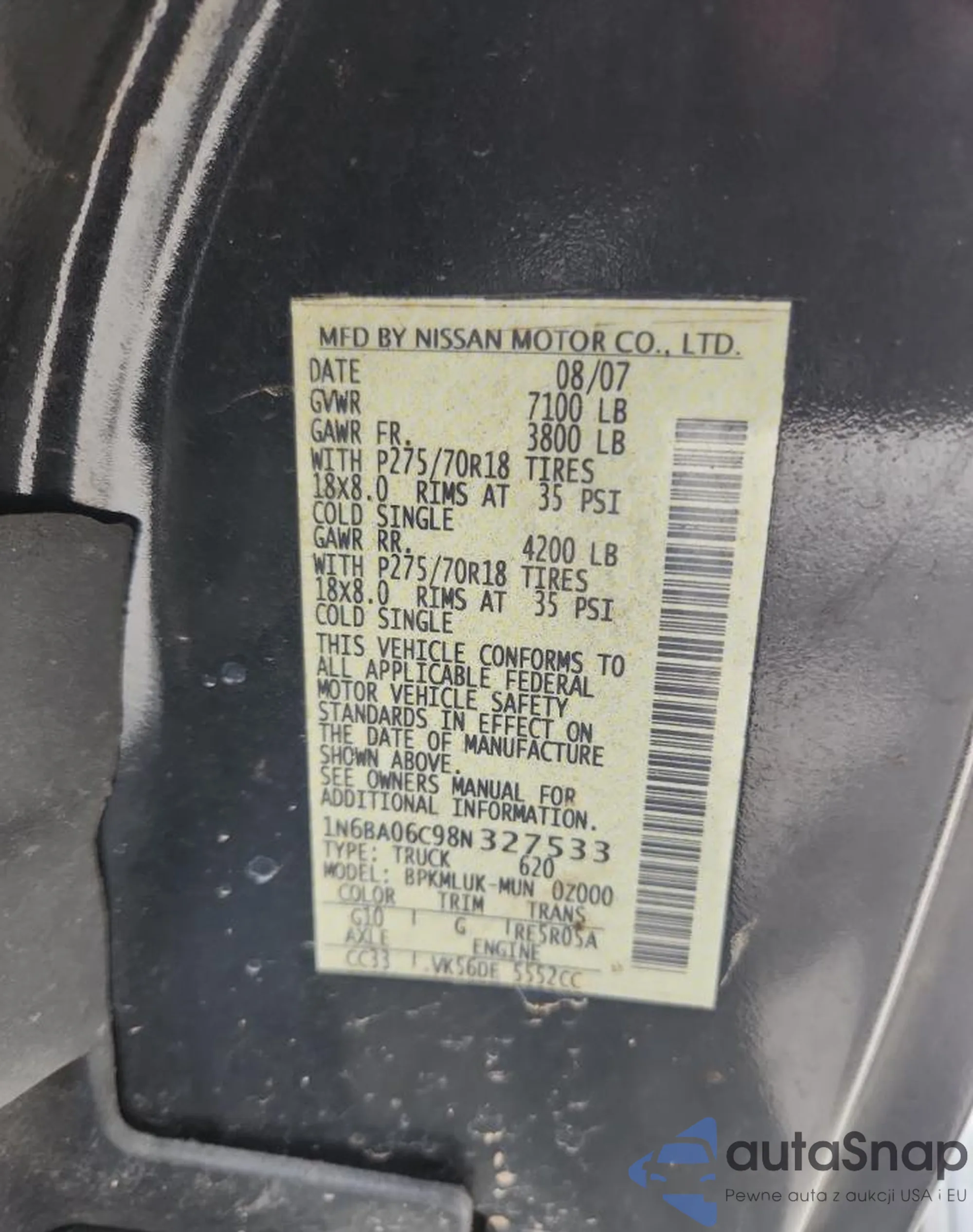 The car Nissan Titan 2008 (VIN 1N6BA06C98N327533) is sold by an unverified seller. We recommend checking the Carfax report and confirming registration possibilities before purchase.