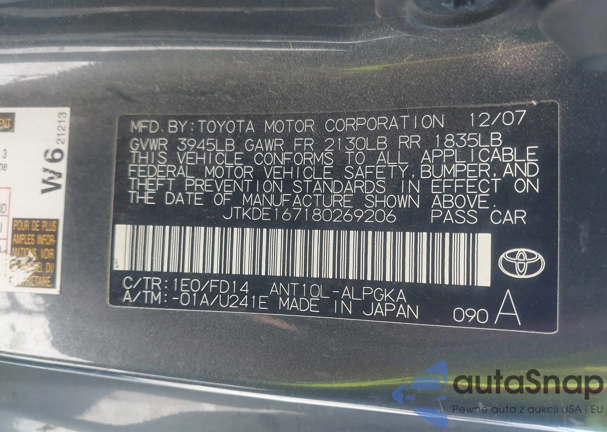VIN: JTKDE167180269206