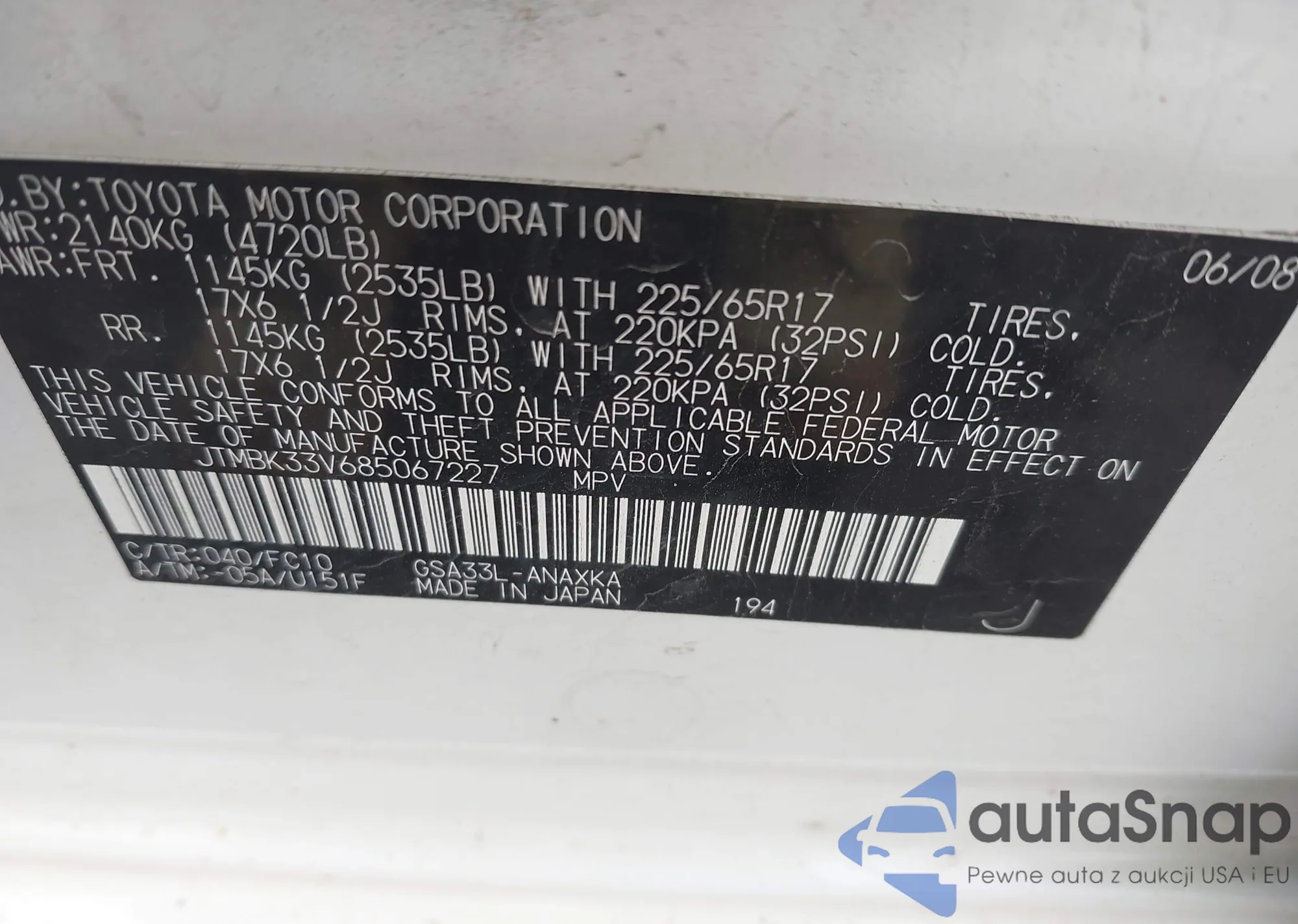 VIN: JTMBK33V685067227