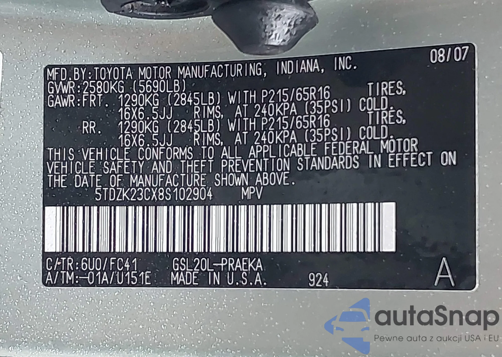 • VIN: 5TDZK23CX8S102904