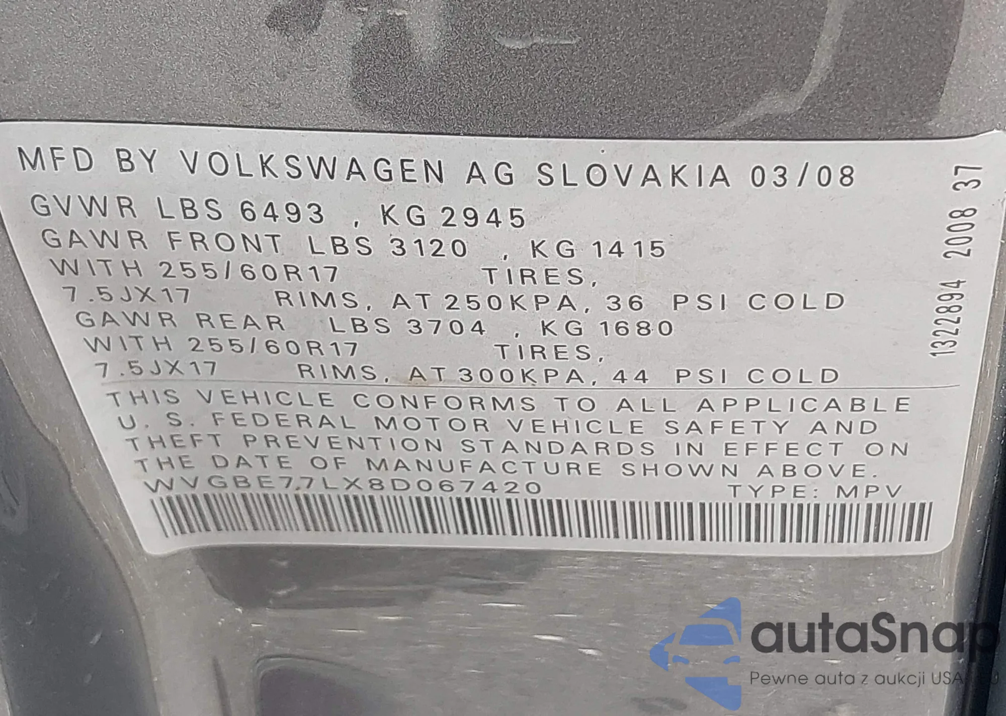 The car Volkswagen Touareg 2008 (VIN WVGBE77LX8D067420) has already been auctioned 1 times and/or is sold by an unverified seller. We recommend checking the Carfax report and confirming registration possibilities before purchase.