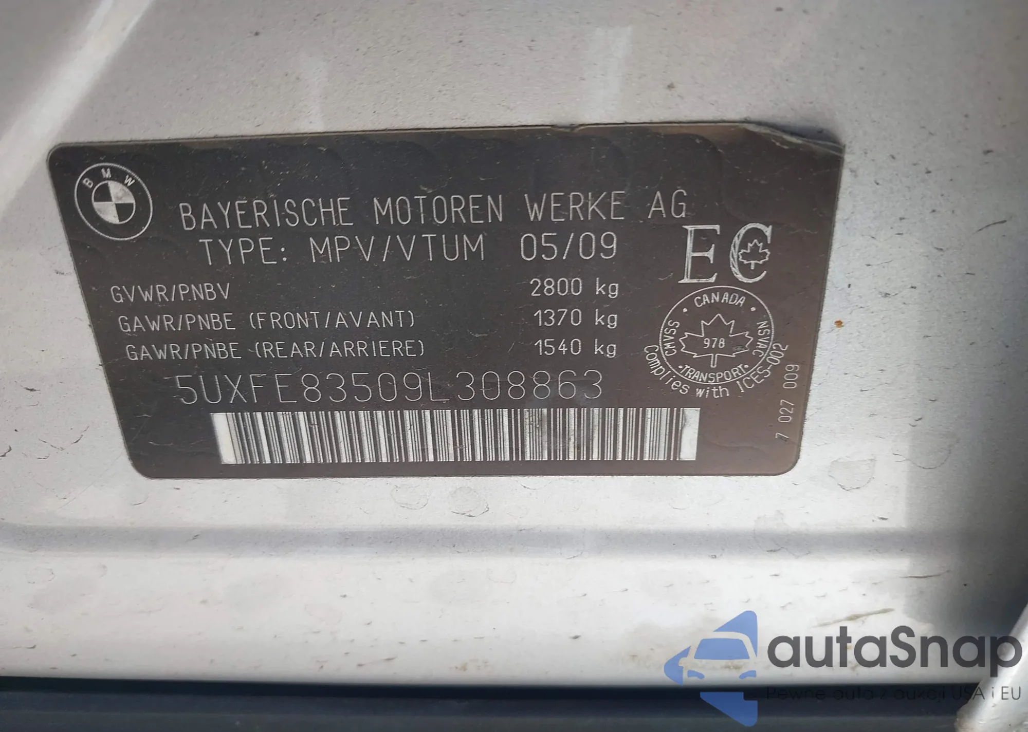 • VIN: 5UXFE83509L308863