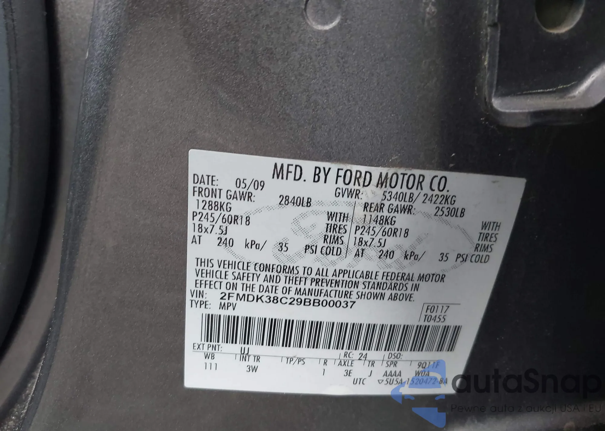 The car Ford Edge 2009 (VIN 2FMDK38C29BB00037) has not been auctioned before. The documents are clean, and the mileage matches or is below the market average. Sold by an insurance company – we recommend purchase. Delivery to the port will take approx. 6–8 weeks.