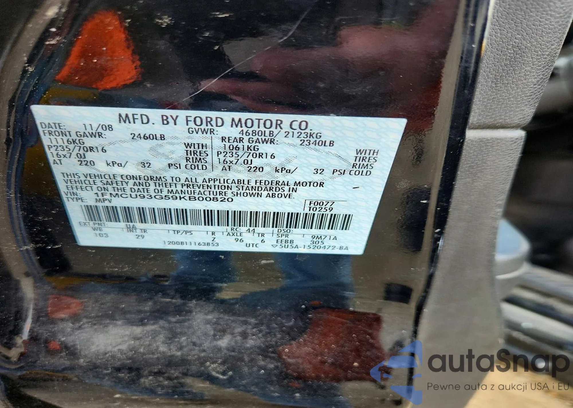 The car Ford Escape 2009 (VIN 1FMCU93G59KB00820) has not been auctioned before. The documents are clean, and the mileage matches or is below the market average. Sold by an insurance company – we recommend purchase. Delivery to the port will take approx. 6–8 weeks.