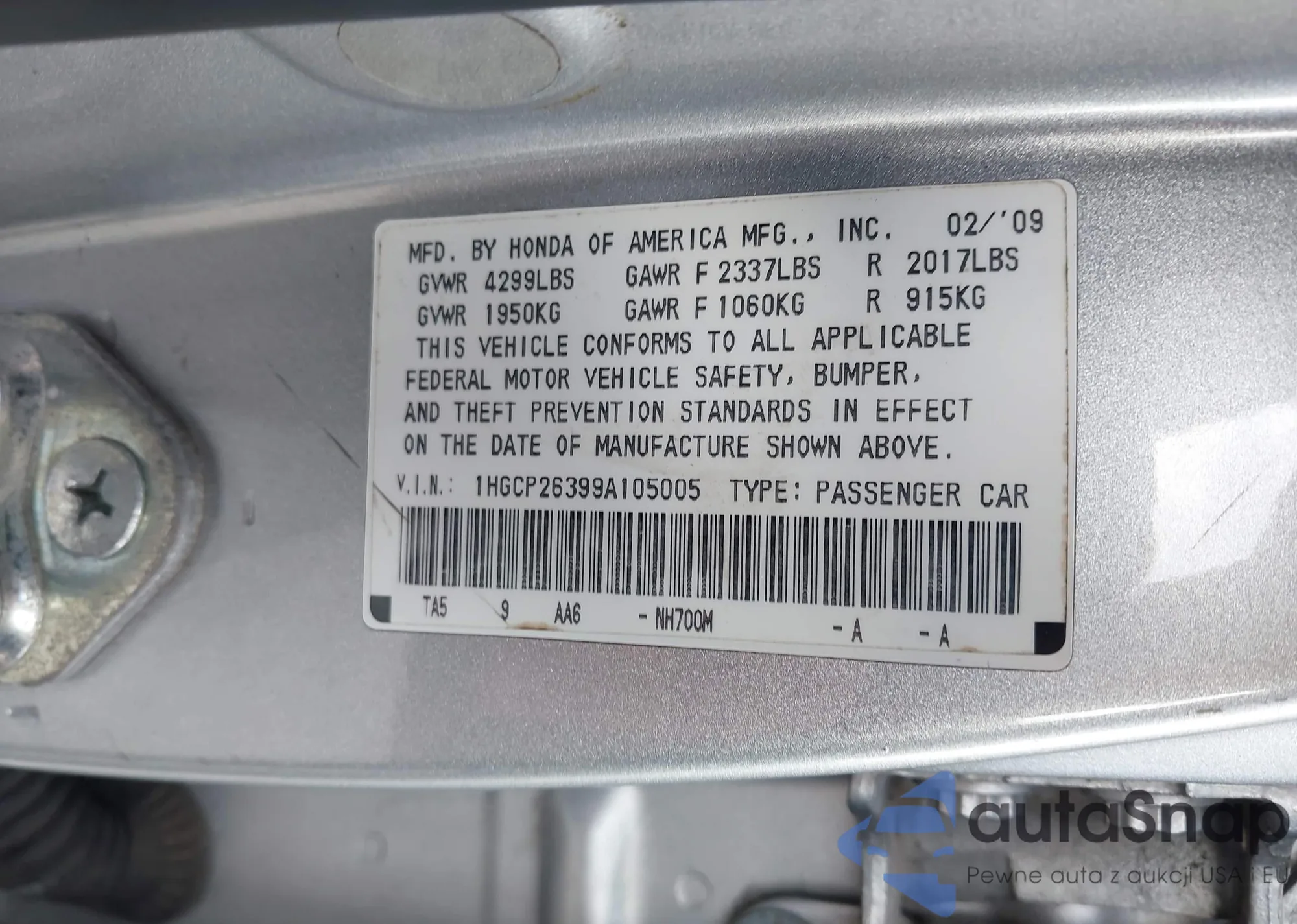 VIN: 1HGCP26399A105005