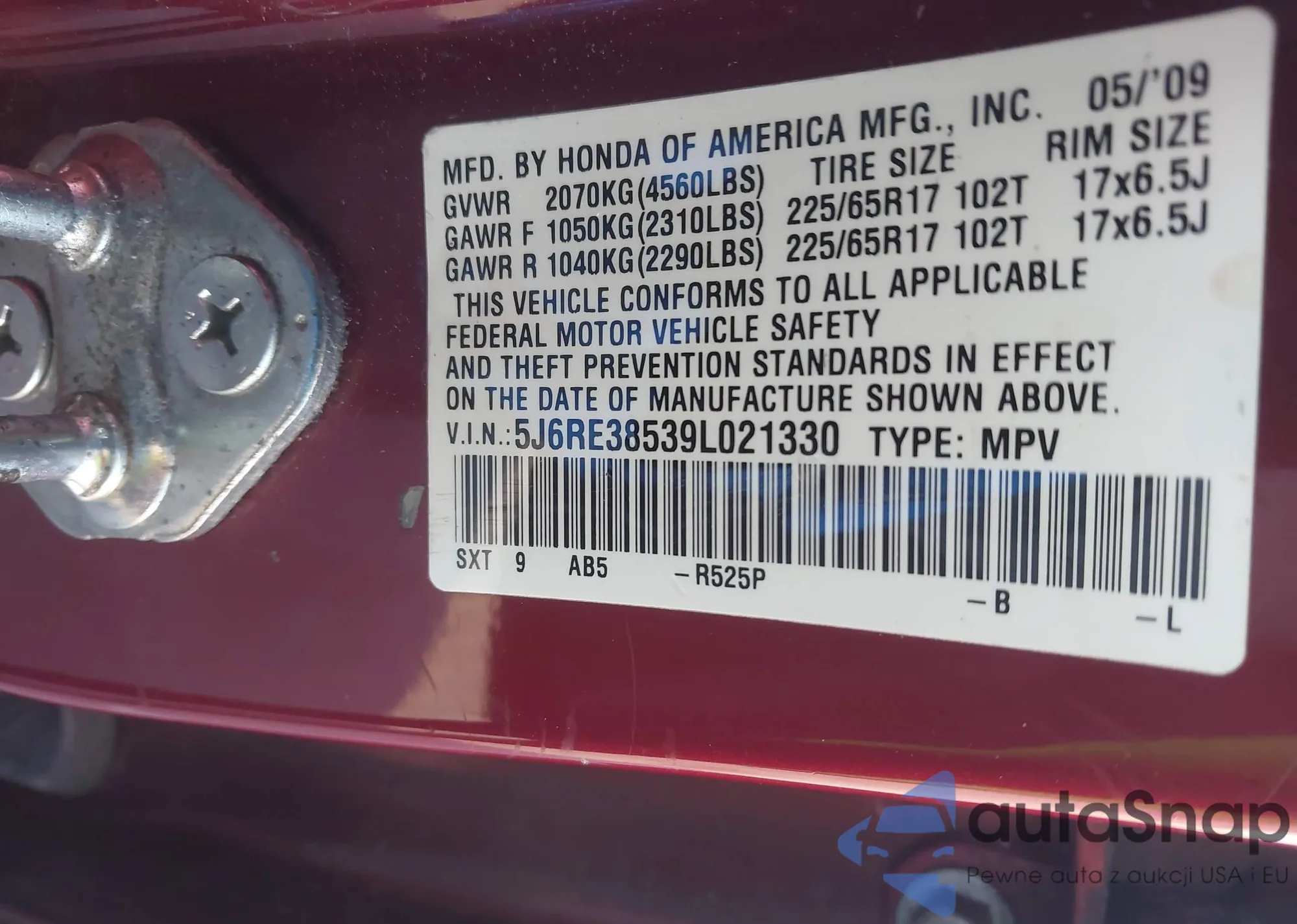 VIN: 5J6RE38539L021330