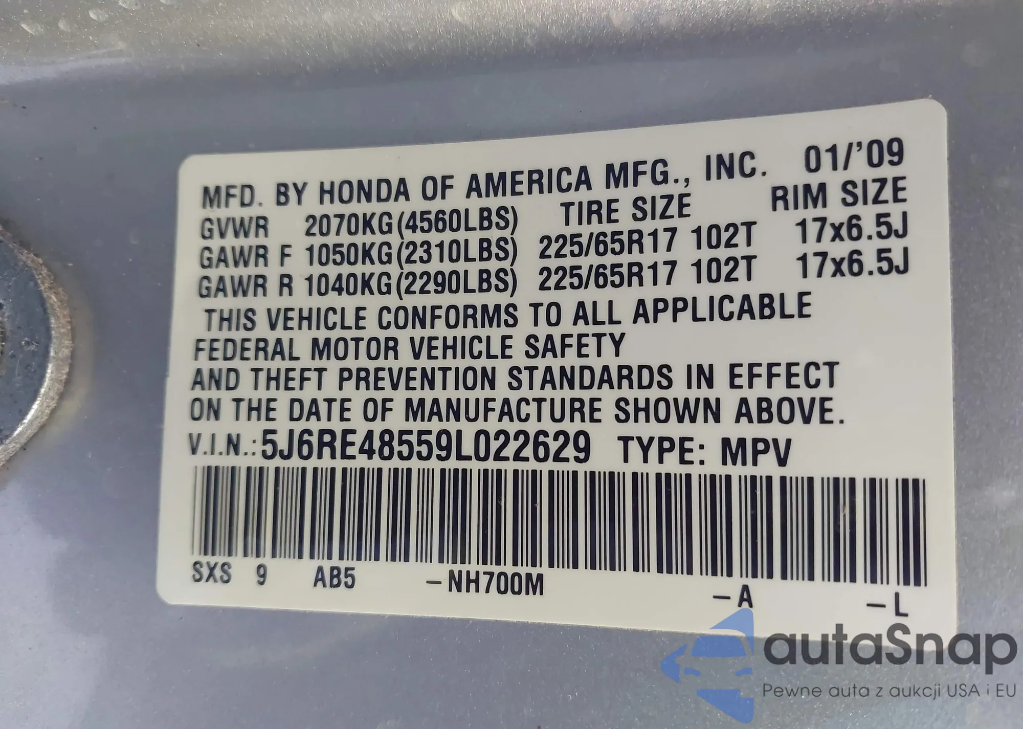 VIN: 5J6RE48559L022629