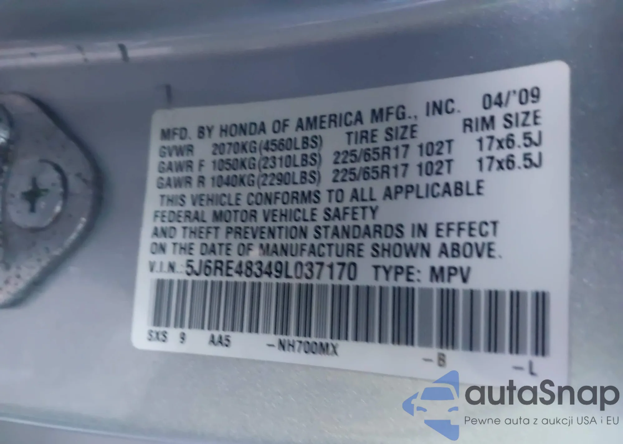 • VIN: 5J6RE48349L037170