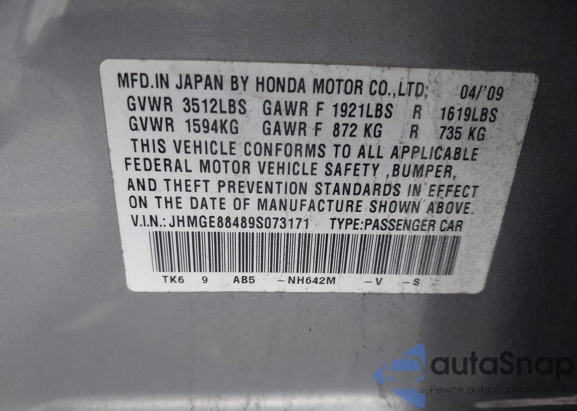 • VIN: JHMGE88489S073171