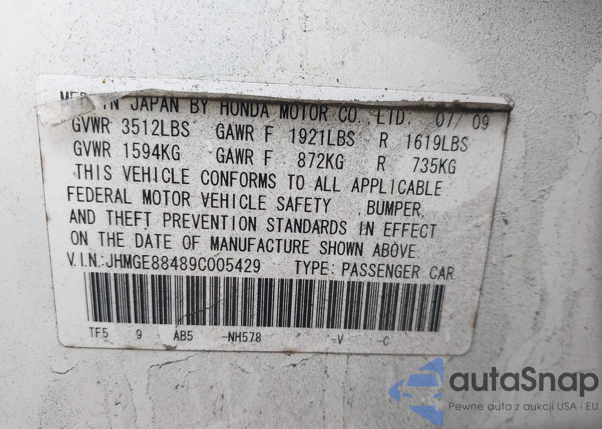 • VIN: JHMGE88489C005429