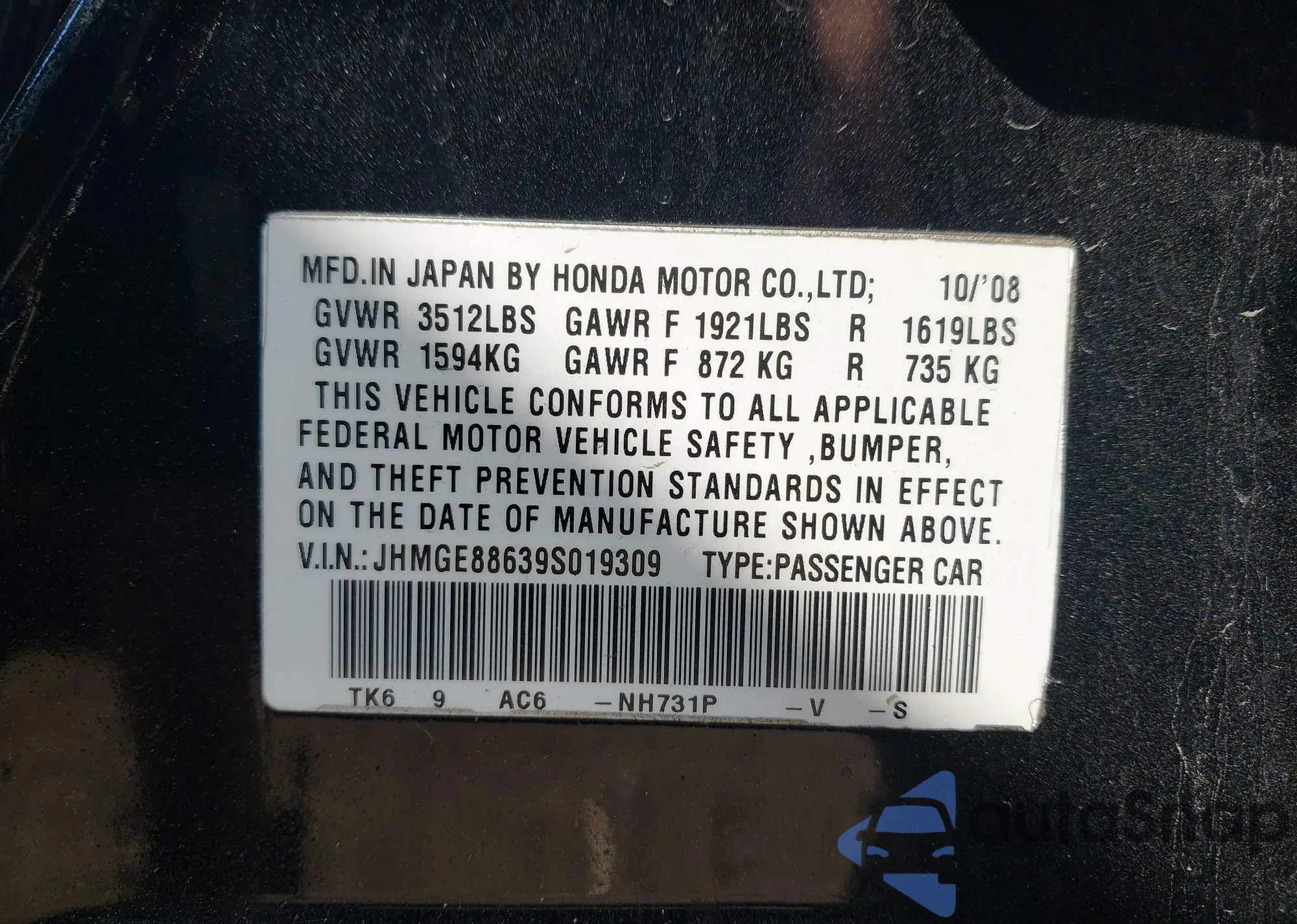 VIN: JHMGE88639S019309