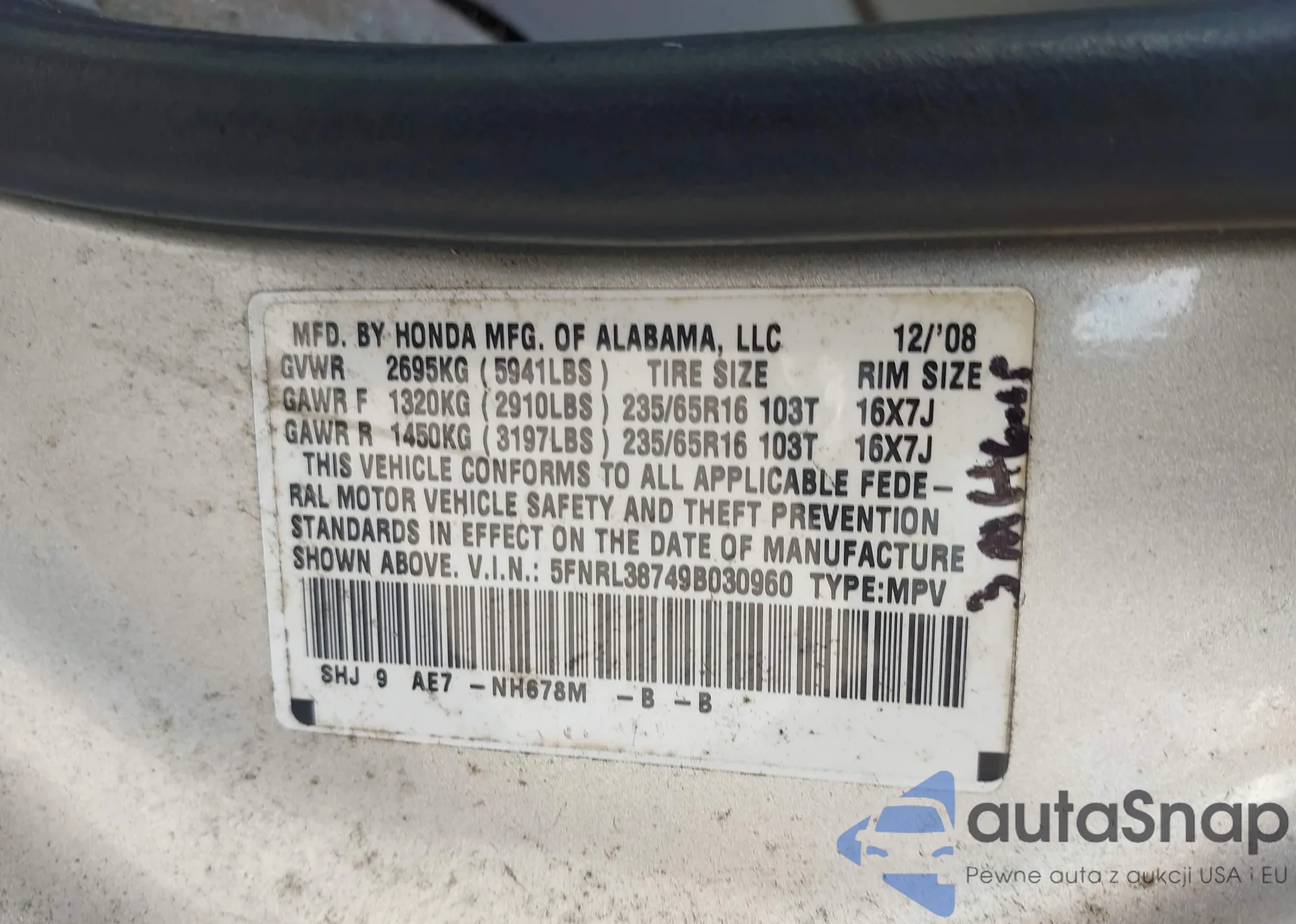 VIN: 5FNRL38749B030960