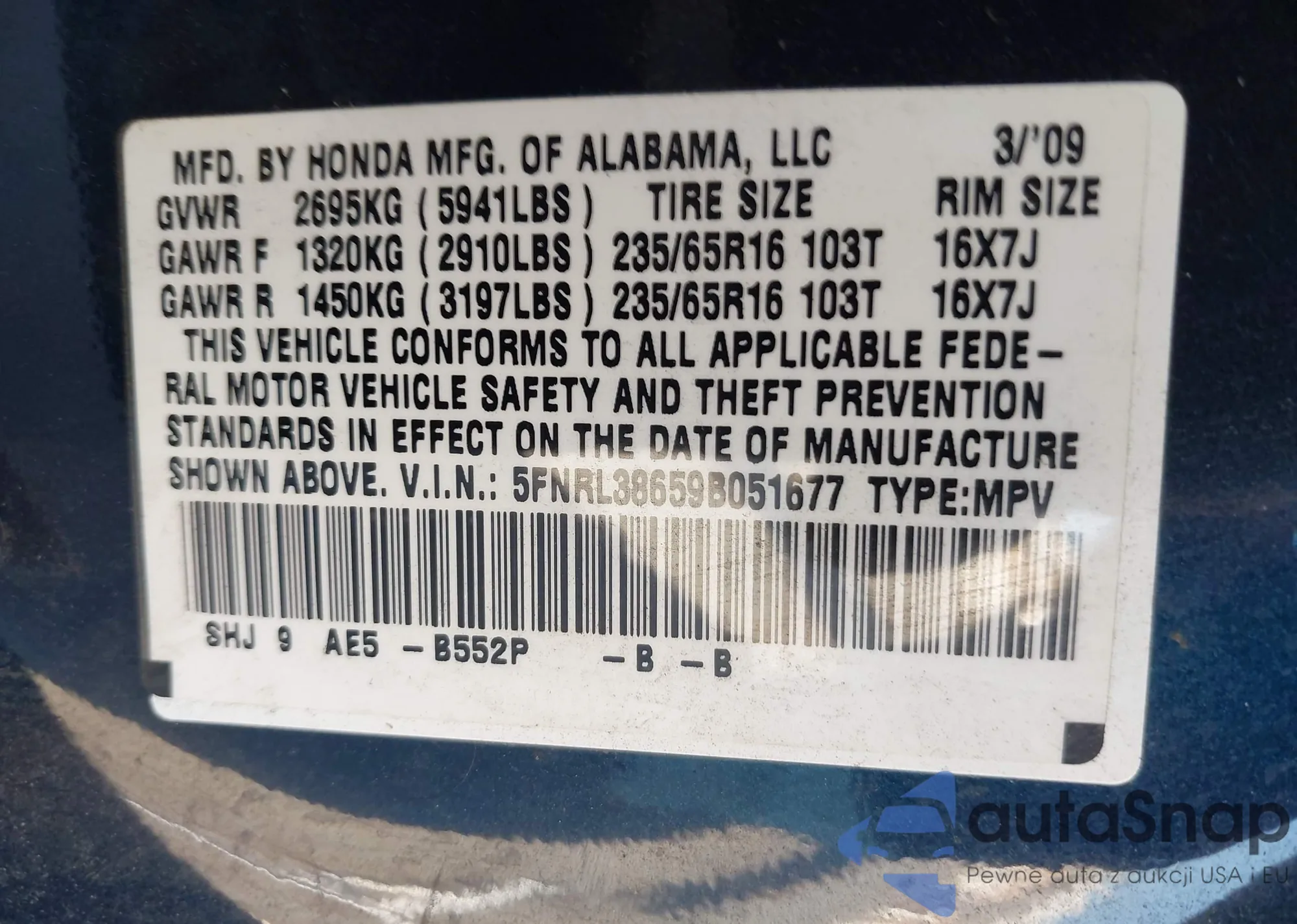 VIN: 5FNRL38659B051677