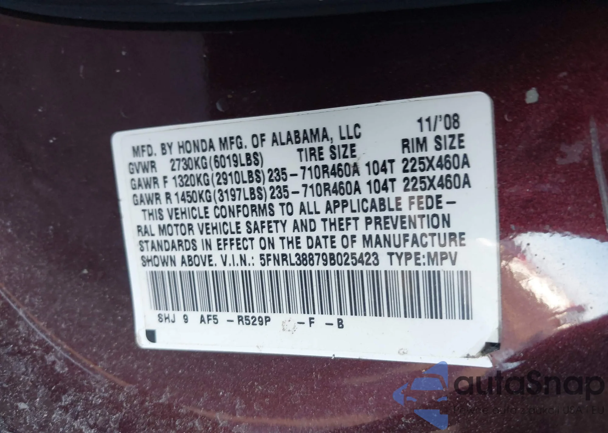 The car Honda Odyssey 2009 (VIN 5FNRL38879B025423) has not been auctioned before. The documents are clean, and the mileage matches or is below the market average. Sold by an insurance company – we recommend purchase. Delivery to the port will take approx. 6–8 weeks.