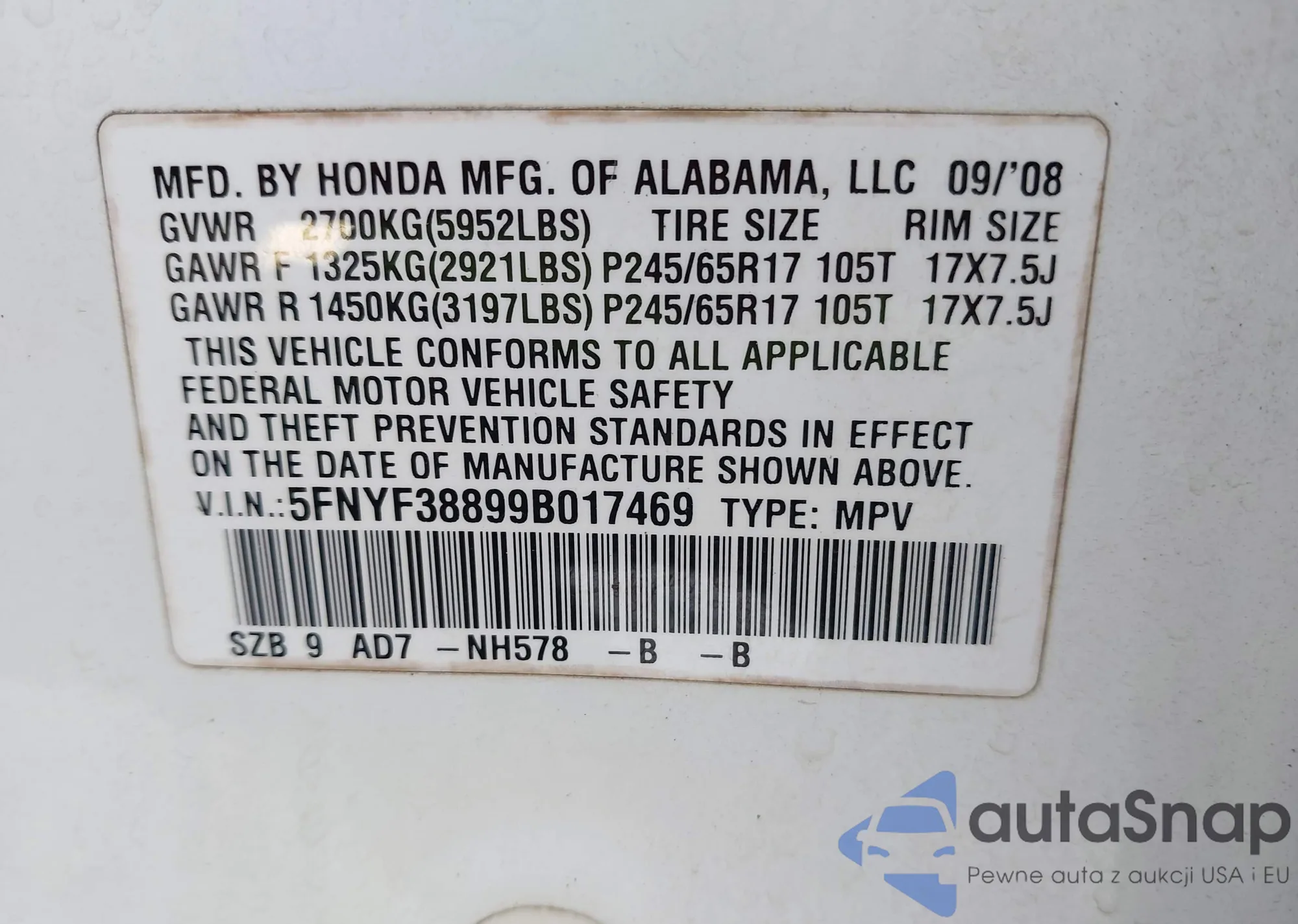 VIN: 5FNYF38899B017469