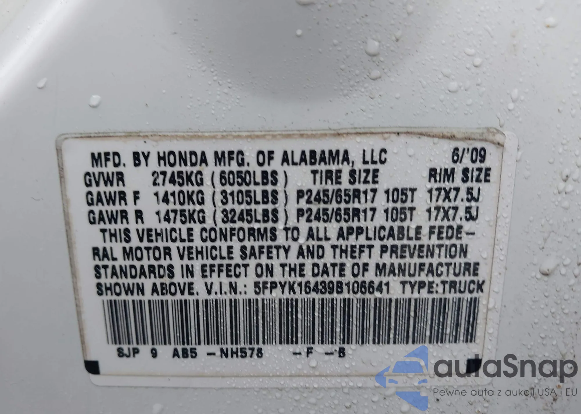 • VIN: 5FPYK16439B106641