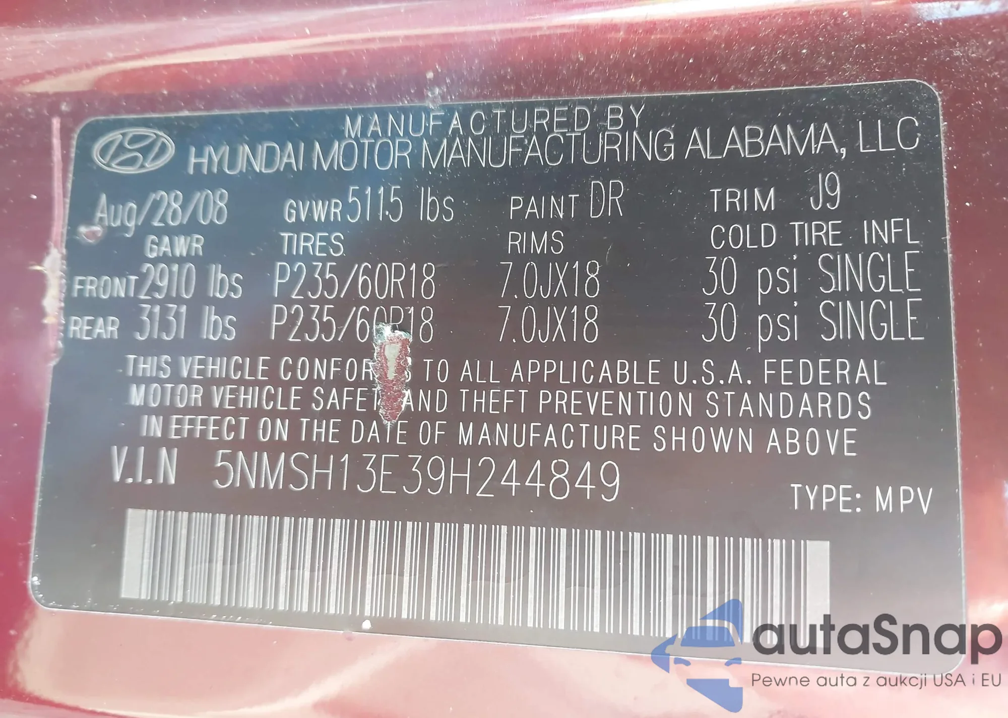 • VIN: 5NMSH13E39H244849