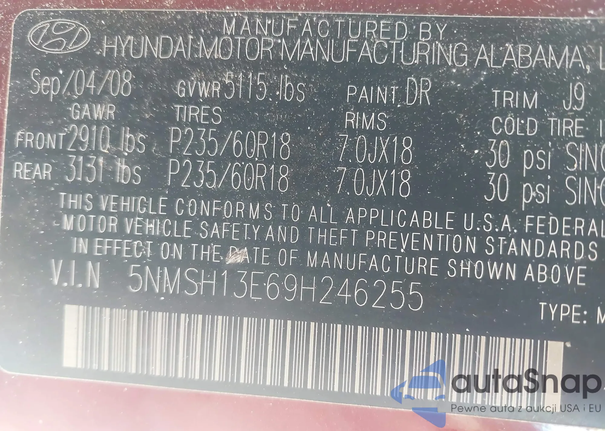 The car Hyundai Santa Fe 2009 (VIN 5NMSH13E69H246255) has not been auctioned before. The documents are clean, and the mileage matches or is below the market average. Sold by an insurance company – we recommend purchase. Delivery to the port will take approx. 6–8 weeks.