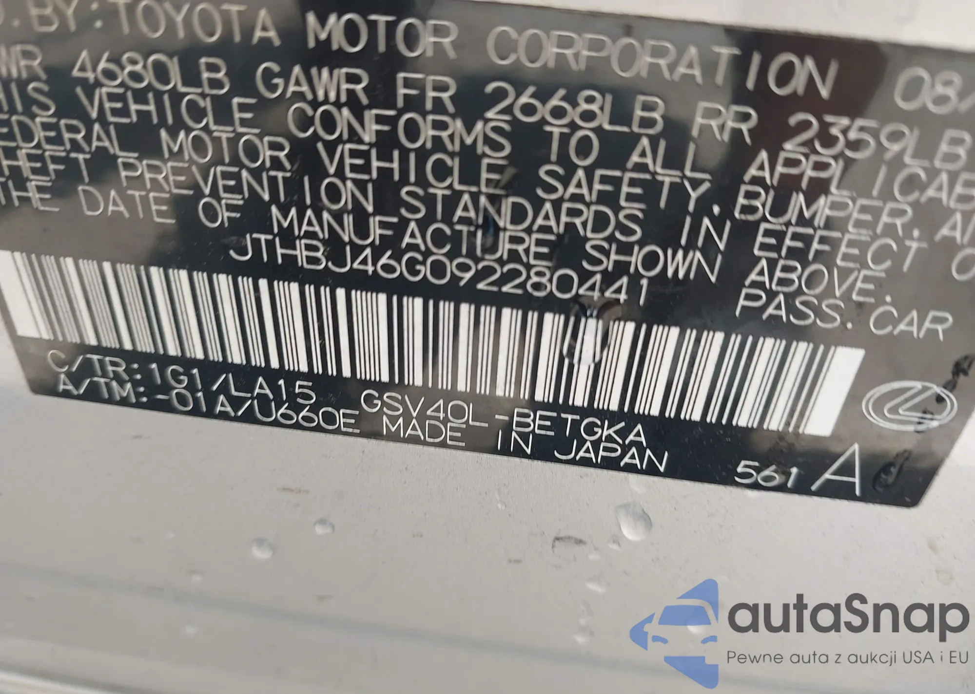 VIN: JTHBJ46G092280441