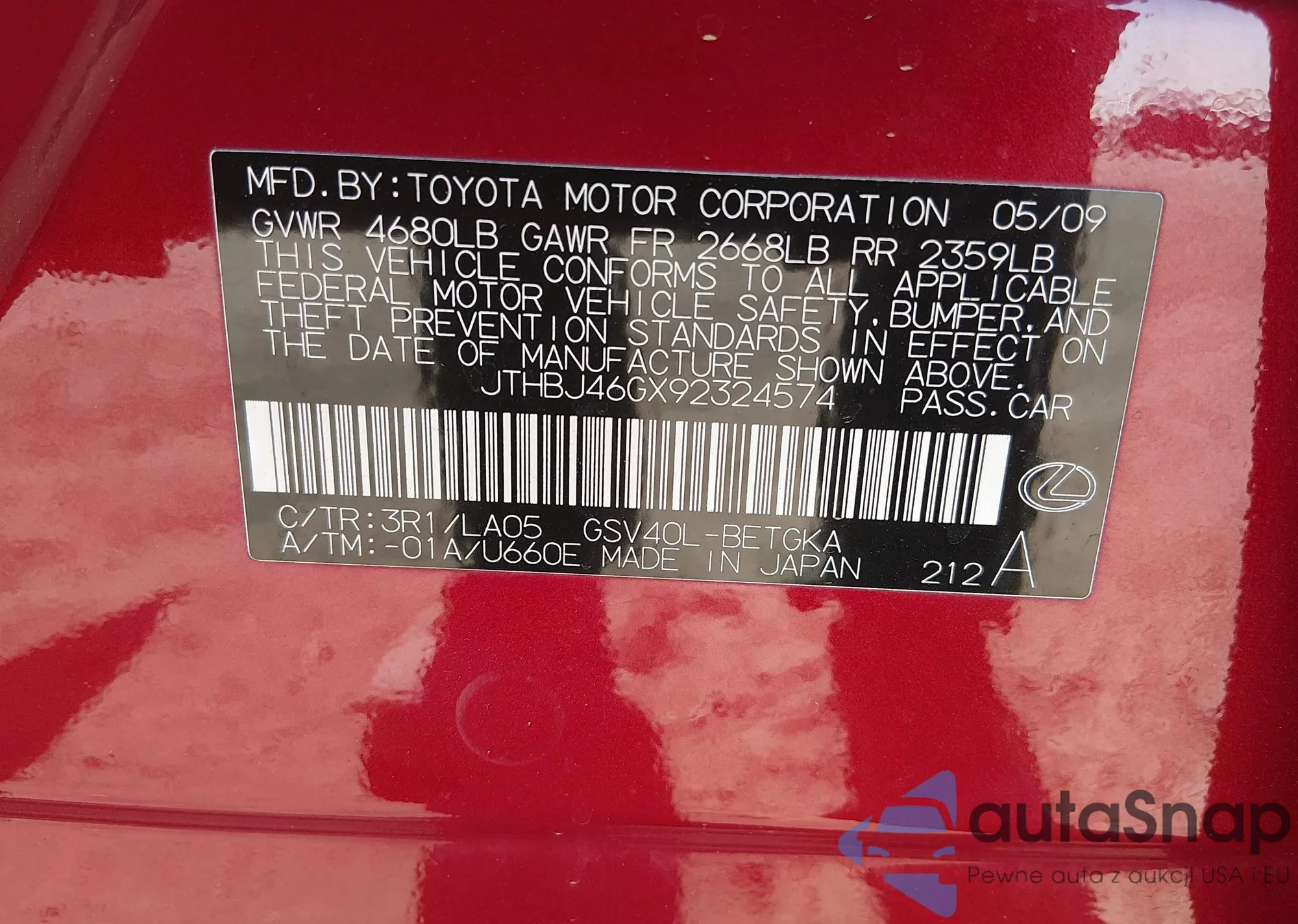 VIN: JTHBJ46GX92324574