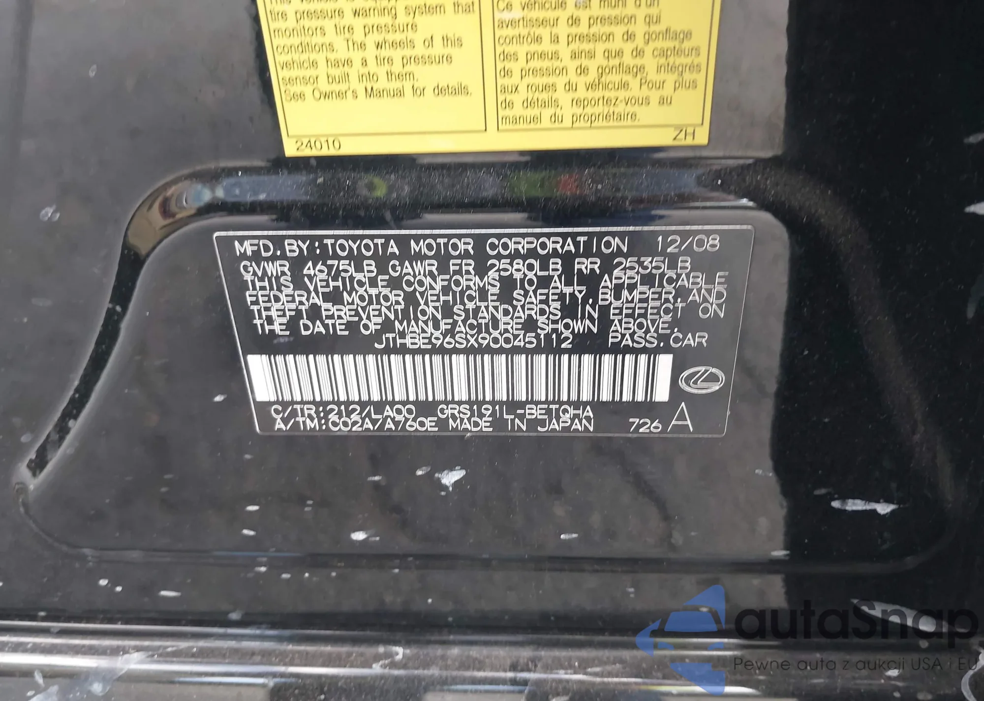 The car Lexus GS 2009 (VIN JTHBE96SX90045112) has not been auctioned before. The documents are clean, and the mileage matches or is below the market average. Sold by an insurance company – we recommend purchase. Delivery to the port will take approx. 6–8 weeks.