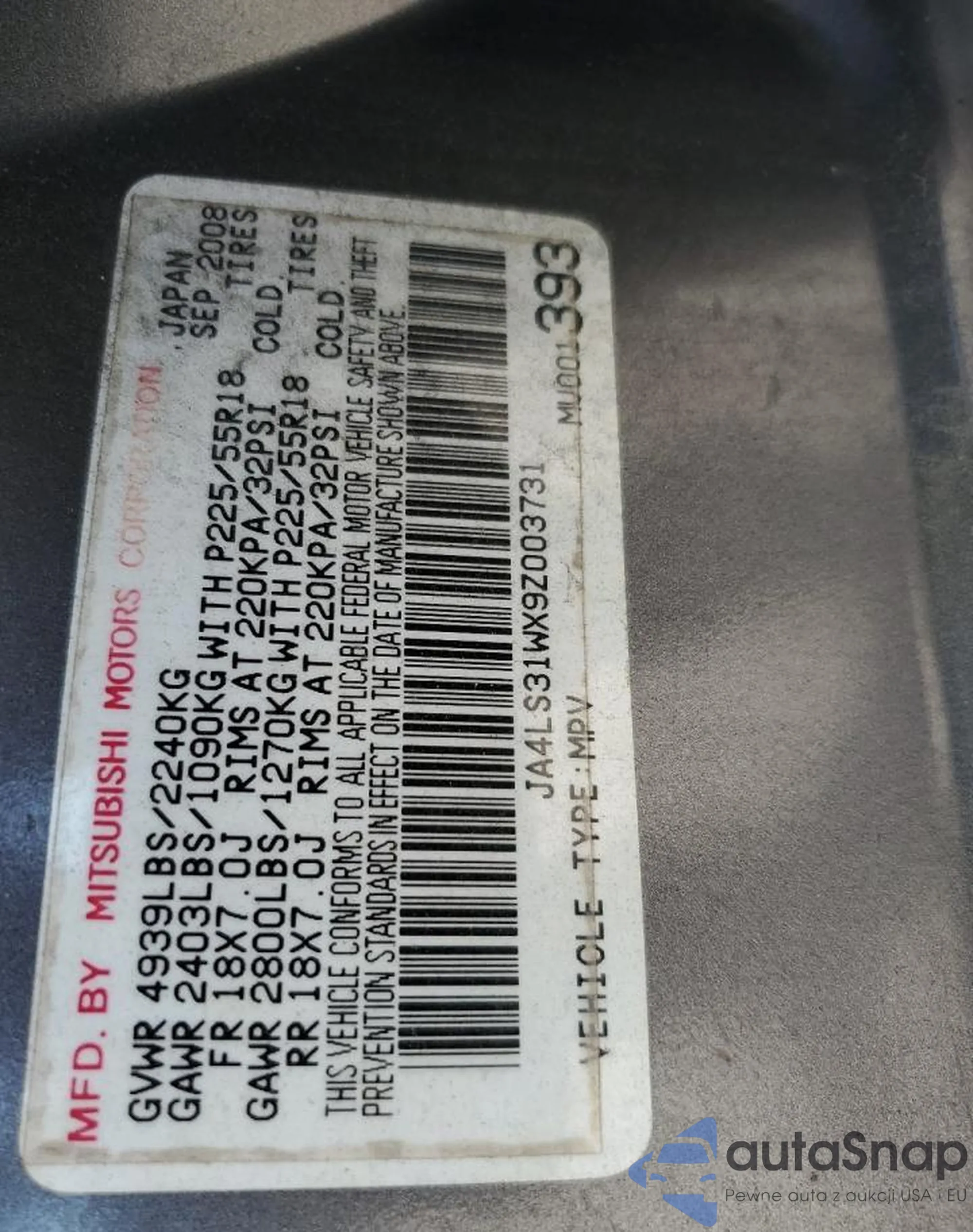 VIN: JA4LS31WX9Z003731