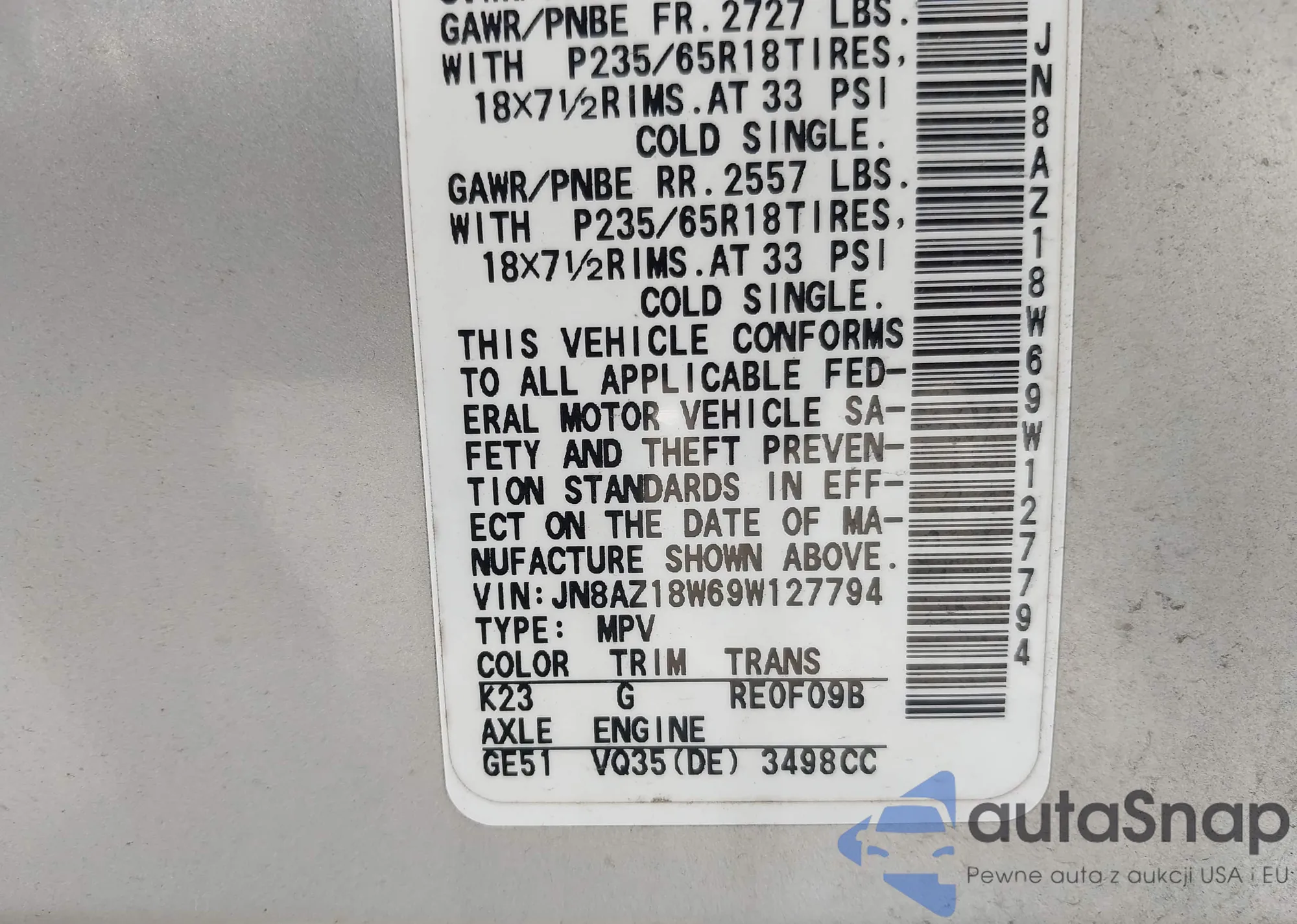 VIN: JN8AZ18W69W127794