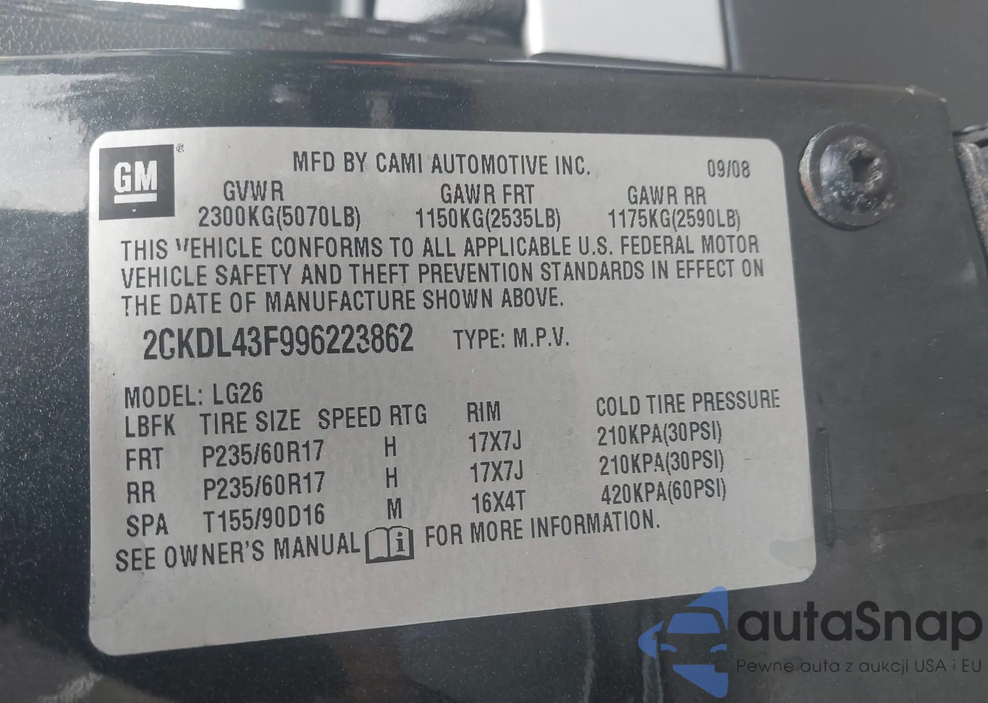The car Pontiac Torrent 2009 (VIN 2CKDL43F996223862) has not been auctioned before (0 auctions). The documents are clean, and the mileage matches or is below the market average. Sold by an insurance company – we recommend purchase. Delivery to the port will take approx. 6–8 weeks.